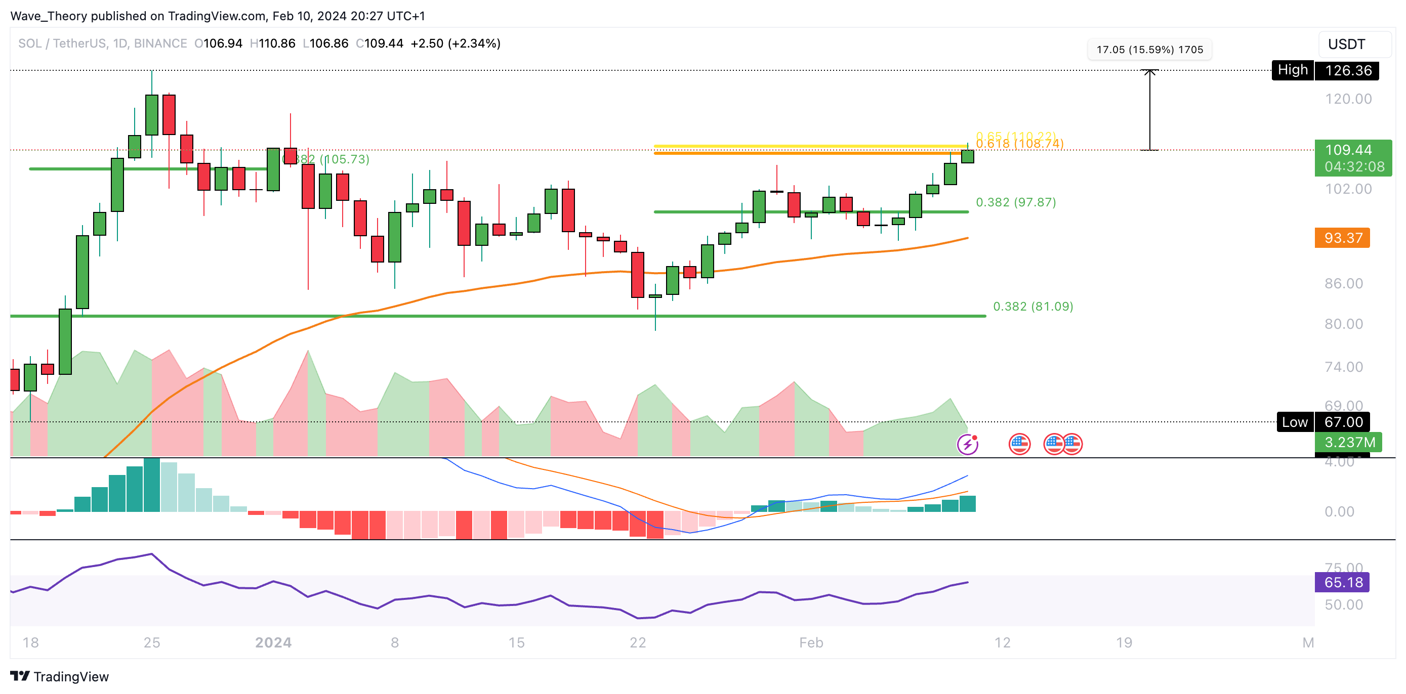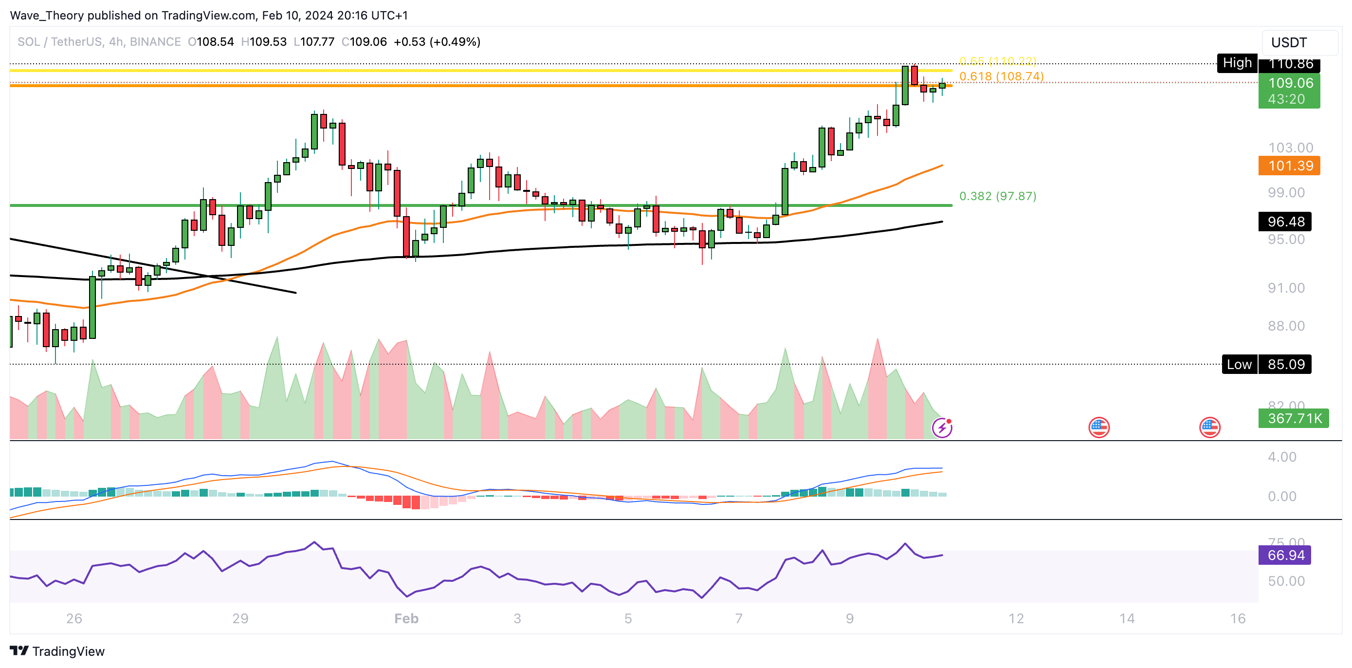 Dort stößt Solana jetzt auf signifikanten Fib Widerstand. Mit einem Bruch wäre die Korrektur beendet und Solana könnte um weitere 15 % steigen, um den letzten Hochpunkt bei rund 126 USD zu erreichen.