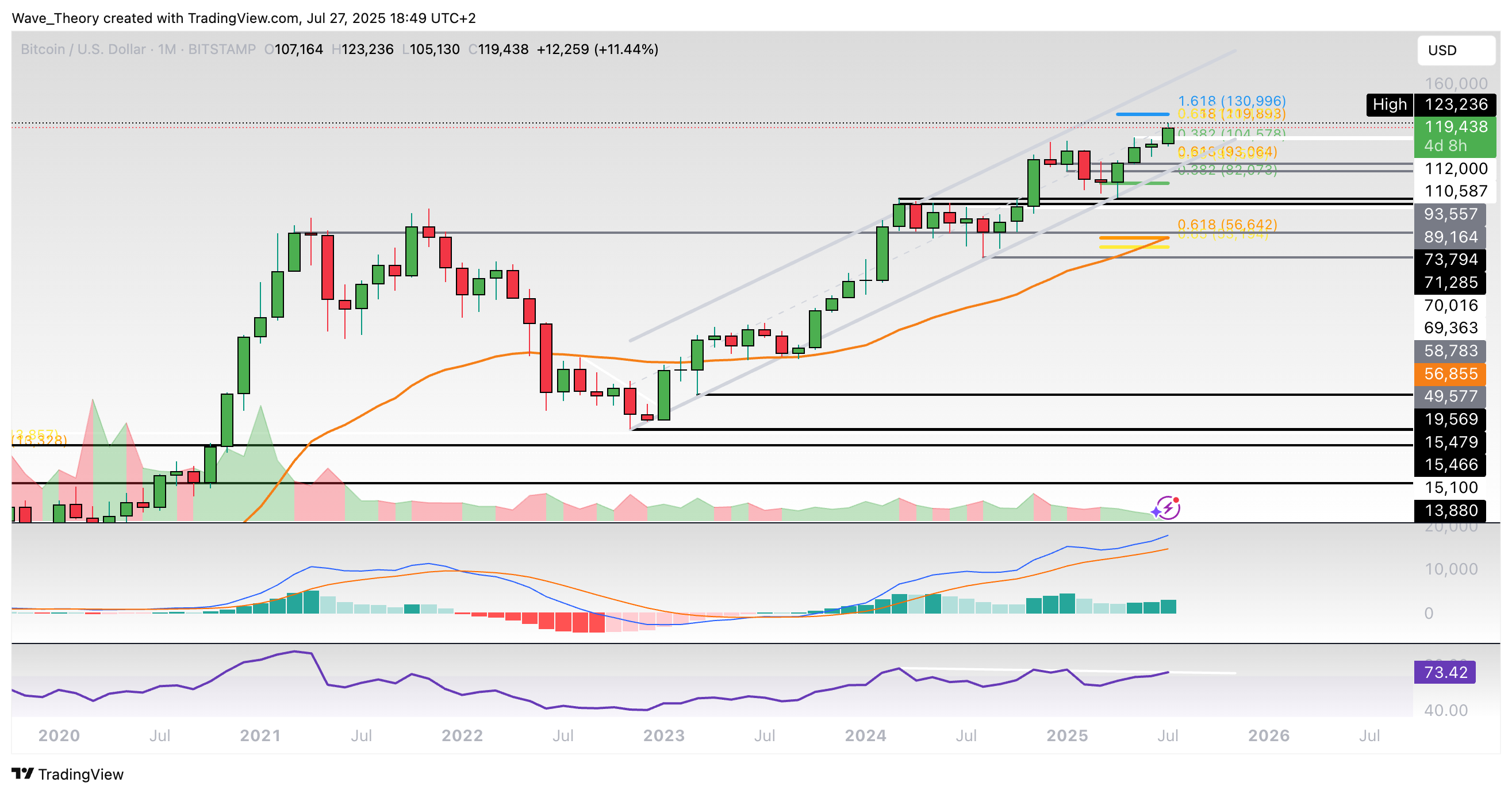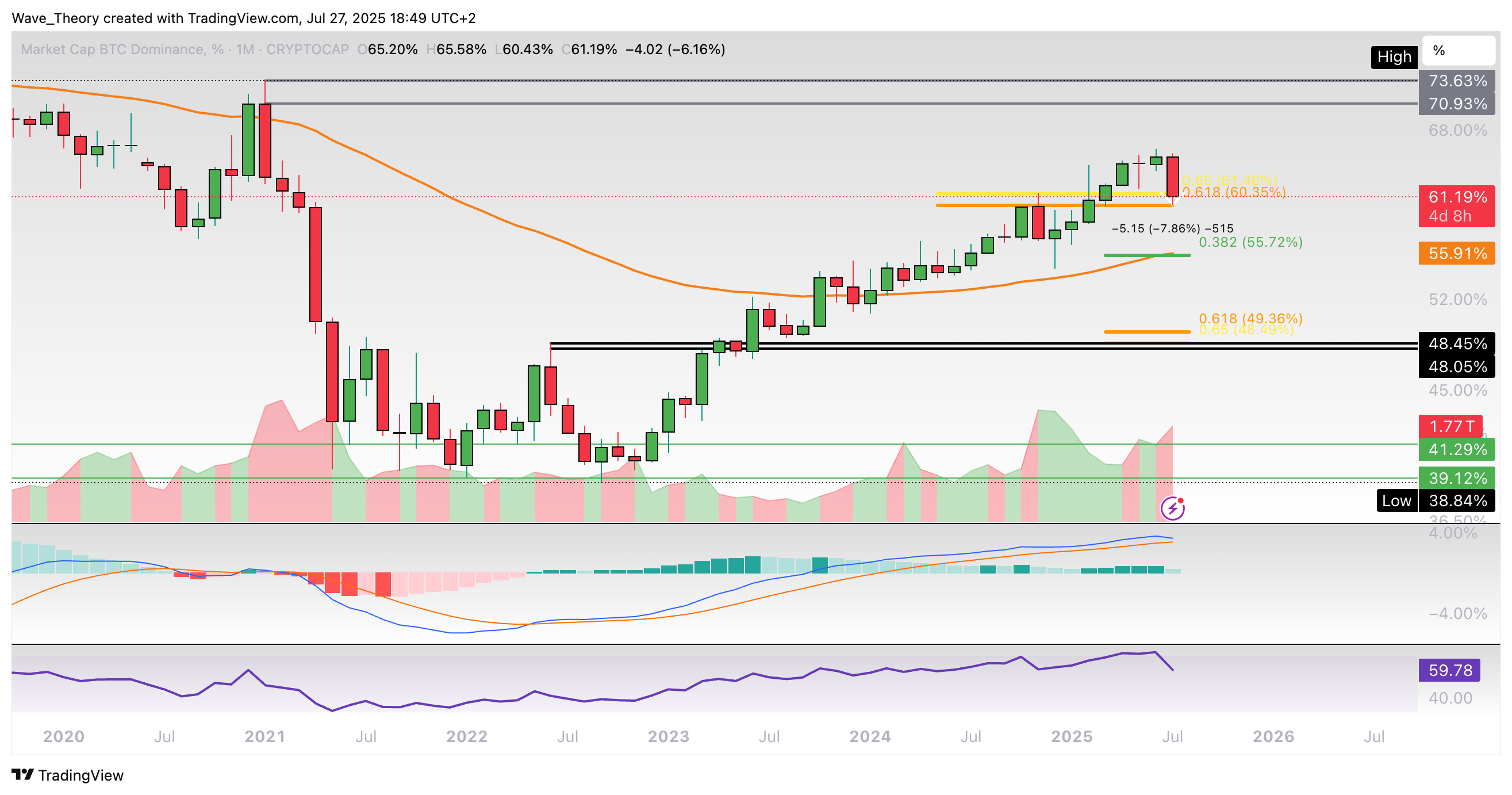 Ansonsten warten bei rund 55,7 % und bei rund 49 % die nächsten signifikanten Fib Unterstützungen. Bei rund 55,9 % fungiert auch der 50-Monate-EMA als zusätzliche Unterstützung.