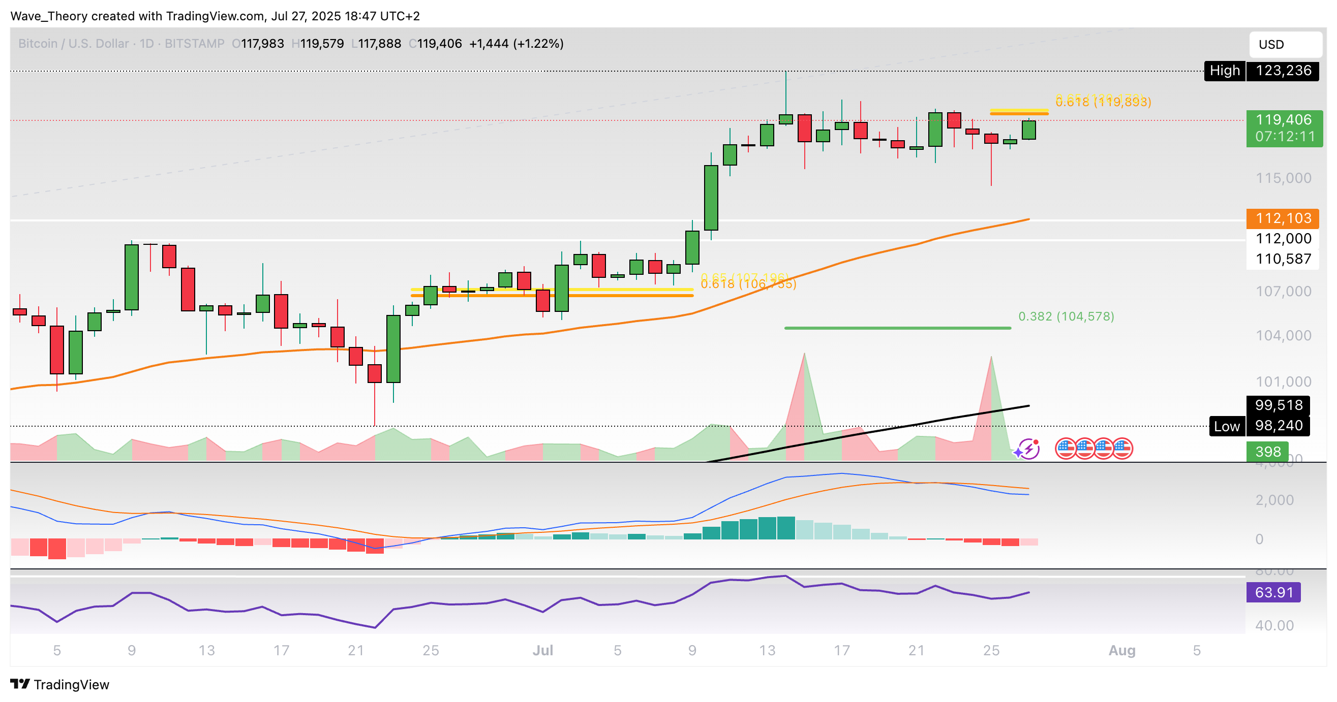 Der RSI grenzt dabei an überkauften Regionen, gibt dabei aber keine eindeutigen Signale. Sollte Bitcoin unerwartet heftig korrigieren, warten spätestens bei rund 104.600 USD und bei rund 91.000 USD signifikante Fibonacci Unterstützung.