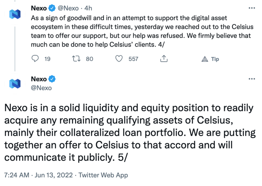 Nexo, einer der größten Konkurrenten der Krypto-Plattform, veröffentlichte vor kurzem mehrere Tweets über Celsius. Am 12. Juni 2022 bot Nexo Celsius seine Hilfe an: