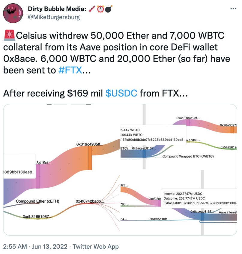 Bevor Celsius die Kundengelder einfror, entnahm die Krypto-Plattform rund 50.000 Ethereum und 7.000 WBTC (“Wrapped Bitcoin”) aus einem der Core-DeFi-Wallets, wie Dirty Bubble Media twitterte. Zum Zeitpunkt der Veröffentlichung des Tweets sind 6.000 WBTC und 20.000 ETH (aktueller Marktwert: ca. 170 Millionen US-Dollar) bereits an die Krypto-Börse FTX geflossen, die zuvor 169 Millionen USDC an Celsius sendete.