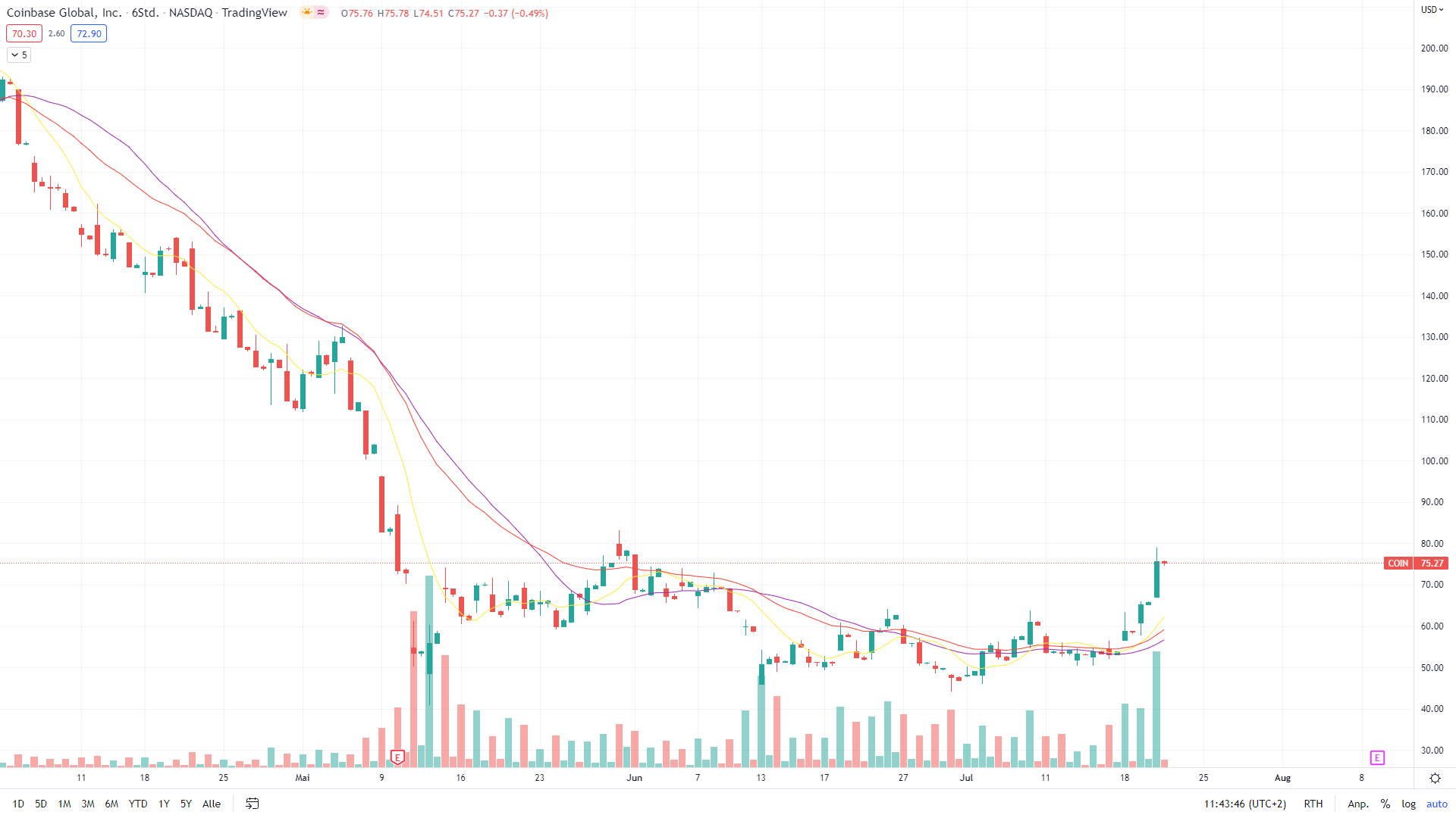 Der Aktienpreis von Coinbase stieg nach der Veröffentlichung des Blogposts auf rund 75 US-Dollar bzw. um 15 % an. Der Kurs der Aktie lag am Jahresanfang noch bei 251 US-Dollar und ist seitdem um über 70 % gefallen.