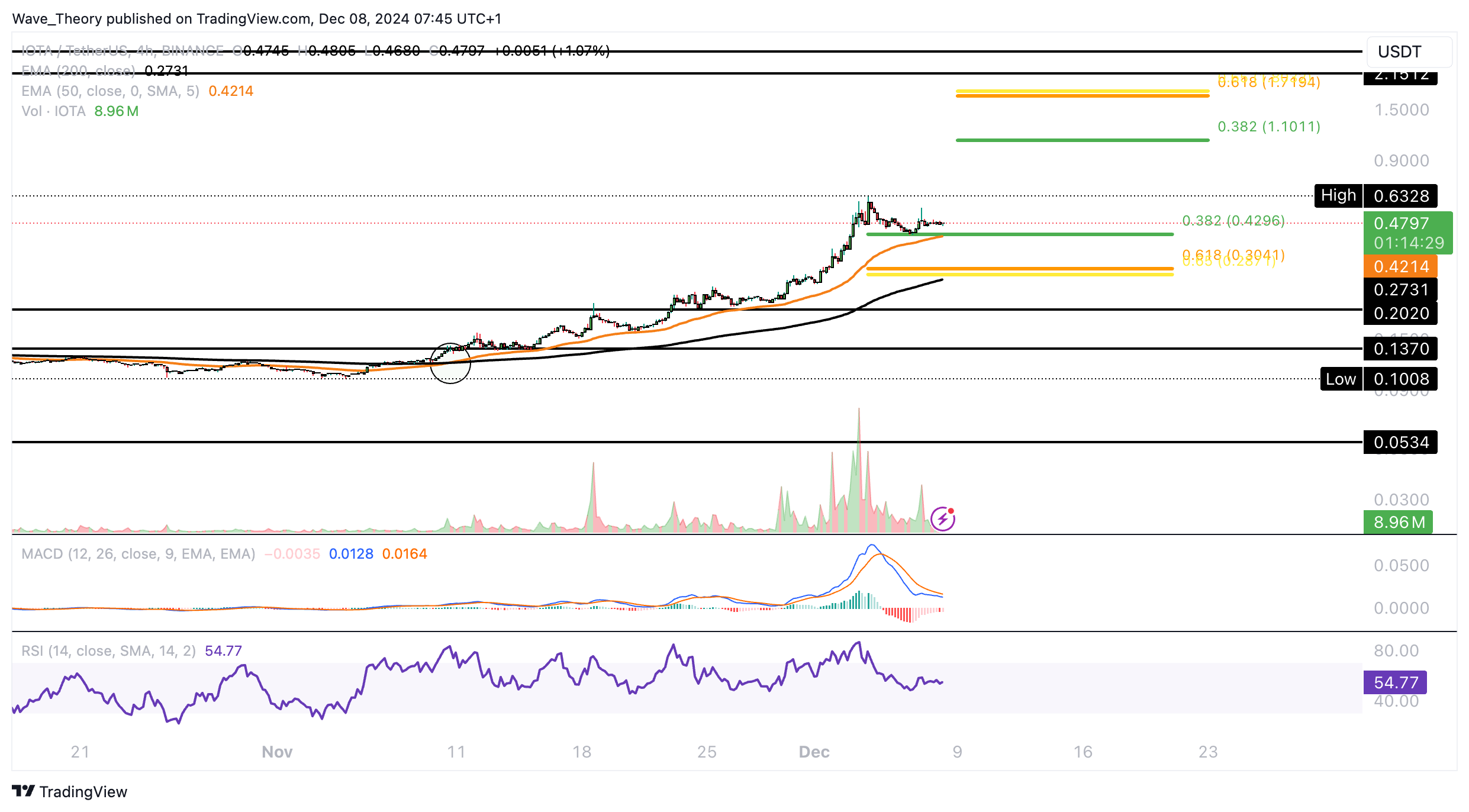 IOTA könnte an der Fib Unterstützung bei rund 0,43 USD respektive 0,3 USD bullisch abprallen, um mittelfristig dne 0,382 Fib Widerstand bei rund 1,1 USD ins Visier zu nehmen.