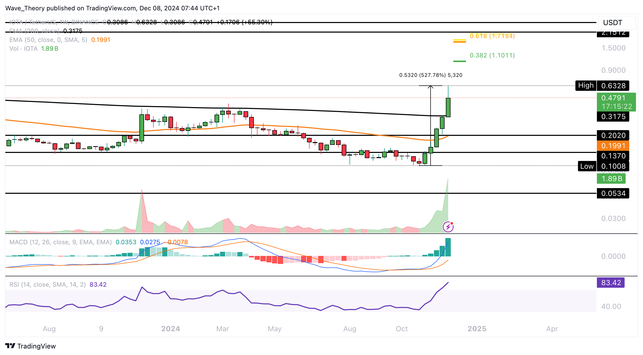 Der IOTA Preis ist an der Unterstützung stark abgeprallt und ist seither über 527 % gestiegen. Wird IOTA zu den nächsten Fib Widerständen steigen können?