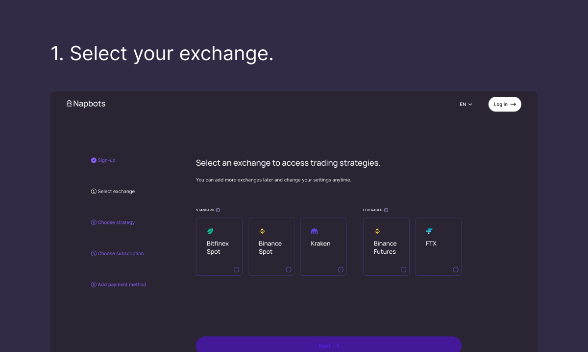 - Verbinde deine bevorzugte Börse: Der erste Schritt besteht darin, Ihre bevorzugte Krypto-Börse zu verbinden, um den Prozess zu beginnen. Ihre Gelder sind vollkommen sicher und Napbots hat keinen Zugriff auf diese. Derzeit werden Börsen wie Kraken, Binance, FTX, Bitfinex, OKex und Huobi unterstützt, und weitere Börsen werden später hinzugefügt.