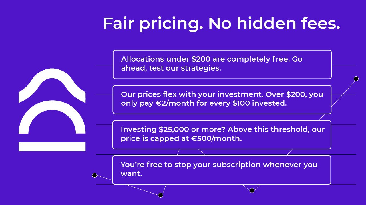 Es ist die einzige Bot-Handelsplattform, die den Nutzern Gebühren nach Maßgabe der Nutzerzuweisungen berechnet. Es gibt keine versteckten Kosten oder Gebühren; alles ist transparent. Für jede investierten 100 US-Dollar werden nur 2 US-Dollar berechnet. Zuteilungen unter einem Betrag von 200 US-Dollar sind kostenlos. Für Zuweisungen, die über 25.000 US-Dollar hinausgehen, sind die Gebühren auf 500 US-Dollar begrenzt.