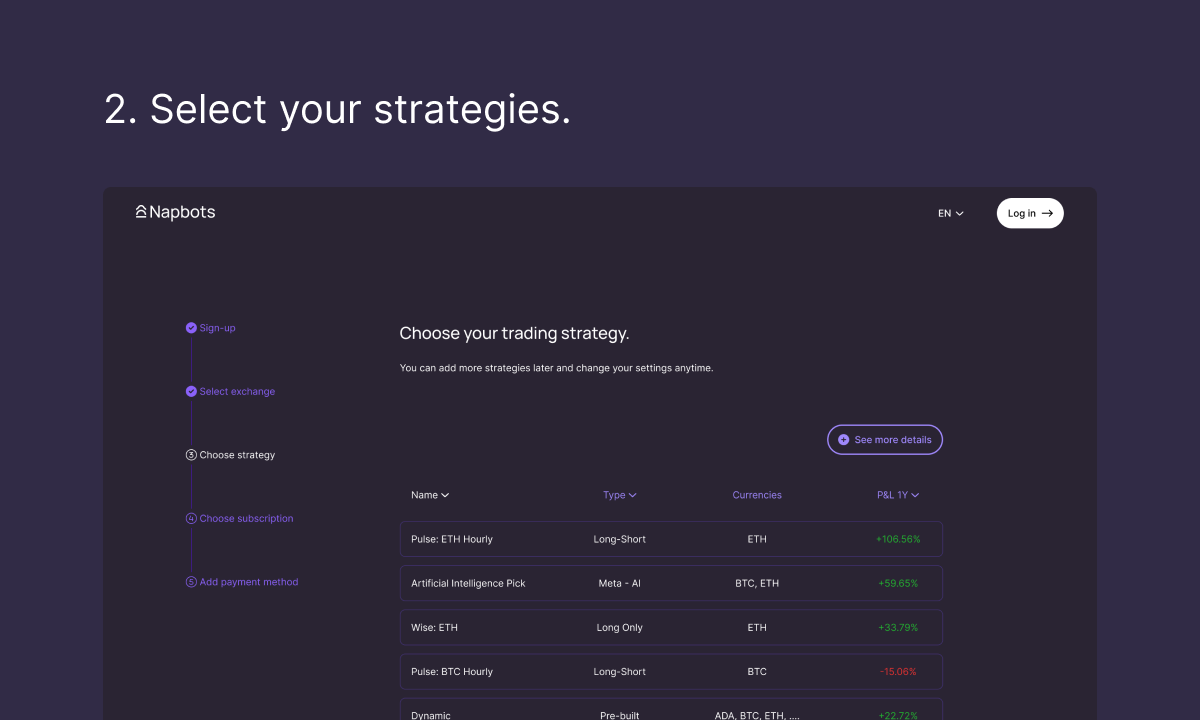 Der gesamte Prozess ist vereinfacht, so dass Händler nicht stundenlang verschiedene Strategien lernen müssen. Napbots bietet einfach zu bedienende algorithmische Strategien. Alles, was Sie tun müssen, ist drei einfachen Schritten zu folgen.