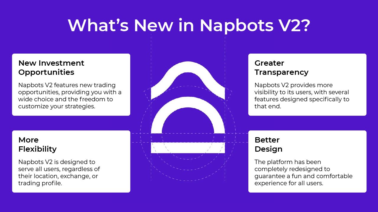 Napbots bietet Tradern seit 2018 effektive Strategien. Nach der Übernahme durch CoinShares im Jahr 2021 wurden die Napbots einem großen Upgrade unterzogen. Die neue Version, die im Juli 2022 bereitgestellt wurde, hat eine Reihe von neuen Funktionen für Händler.