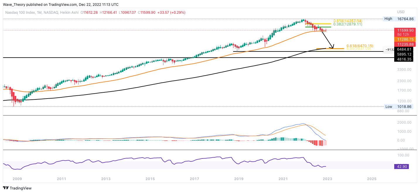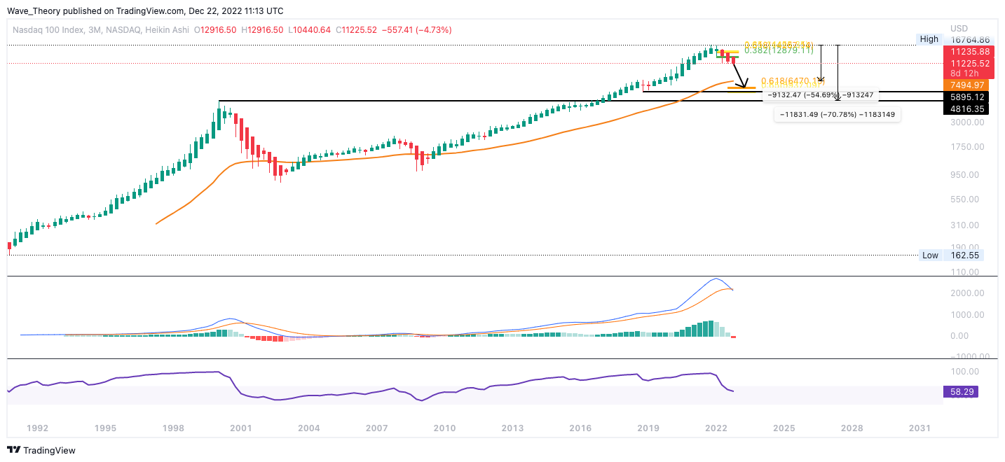 Der Nasdaq 100 Index könnte noch rund 55 % bis 71 % fallen, bis er auf signifikante Unterstützung stößt. Denn zwischen 4.816 und 7.500 wartet signifikante Unterstützung am 50-3Monate-EMA. Zudem liegt dort horizontale und die wichtige Golden Ratio Unterstützung, welche den historisch-tiefsten Punkt des Nasdaq 100 Kurses mit dem Allzeithoch verbindet.