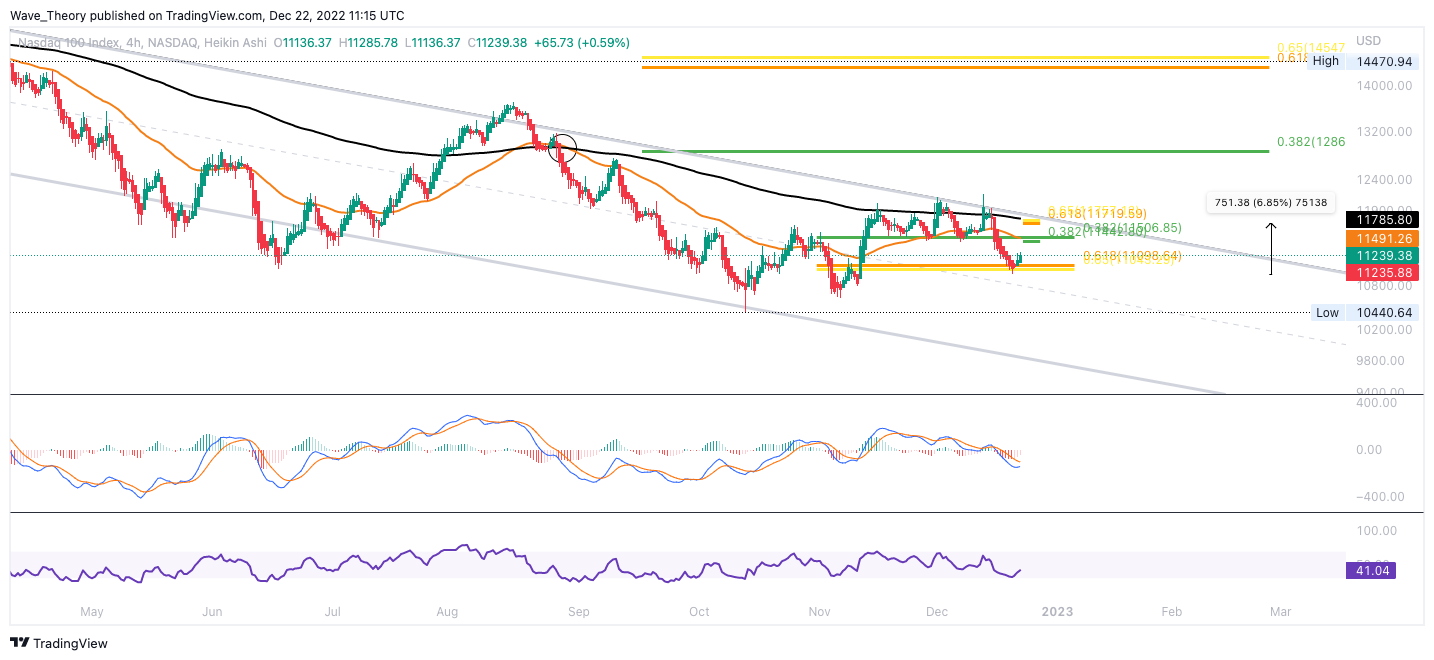 Denn im 4H-Chart prallt der NDX Kurs aktuell an der Golden ratio Unterstützung bei rund 11.098 ab, woraufhin der NDX Kurs jetzt bis zu den nächsten Fib Widerständen bei rund 11.443 respektive rund 11.720 steigen könnte. Darüber hinaus tickt das Histogramm des MACDs im 4H-Chart bullisch höher.