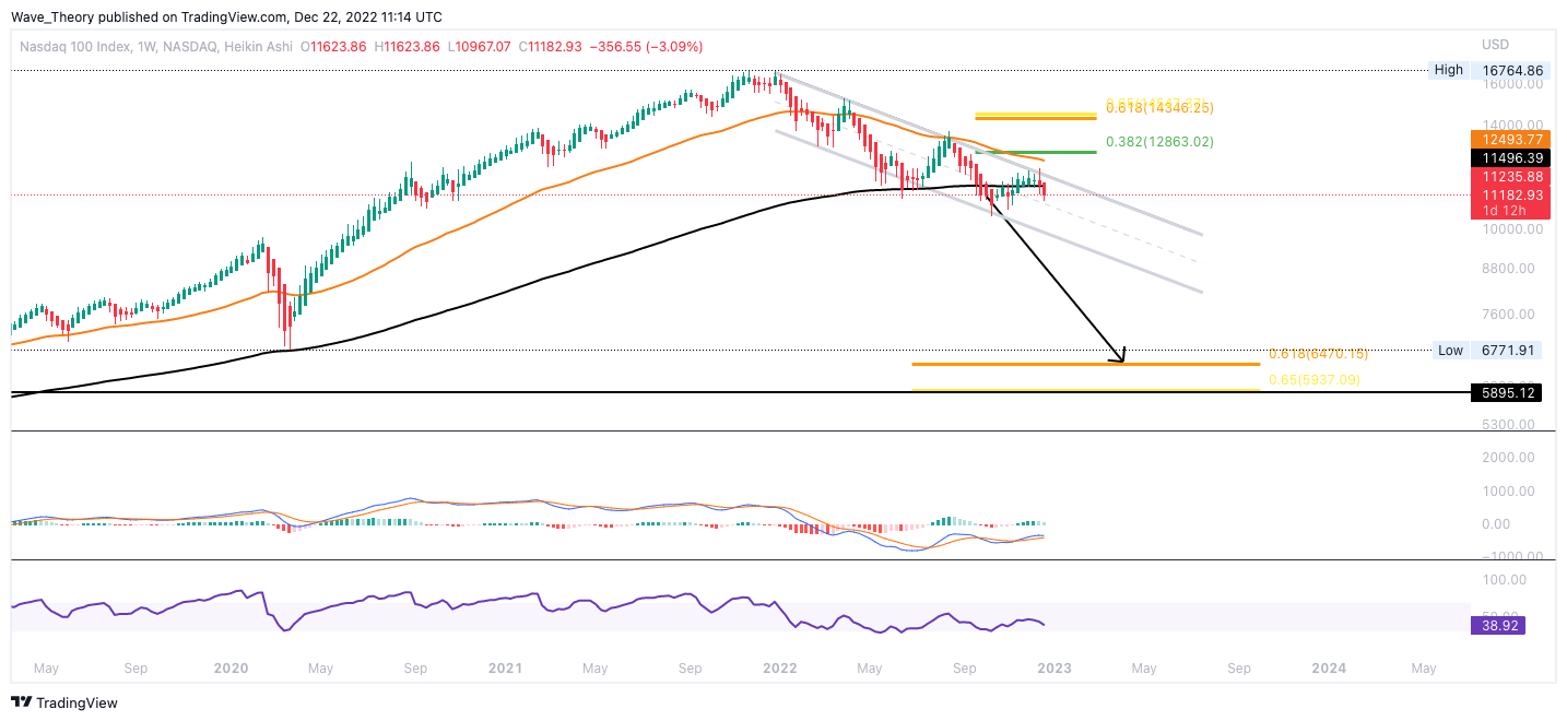 Im Wochenchart befindet sich der NDX Kurs in einem parallelen Abwärtskanal. Zudem scheint der NDX Kurs den Abwärtstrend seit letzter Woche wieder fortzusetzen, nachdem er fast den 50-Wochen-EMA Widerstand erreicht hatte.