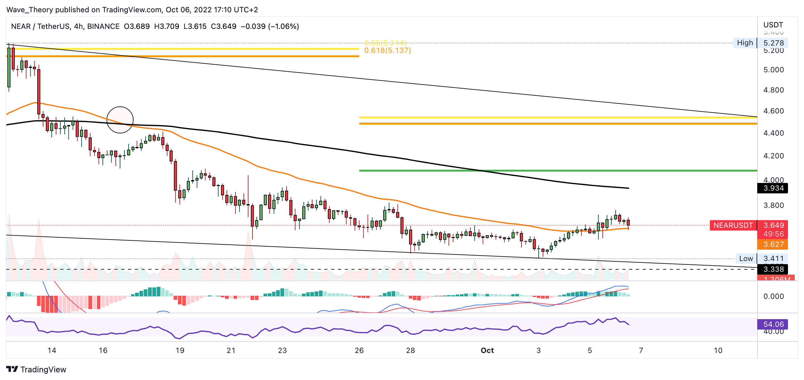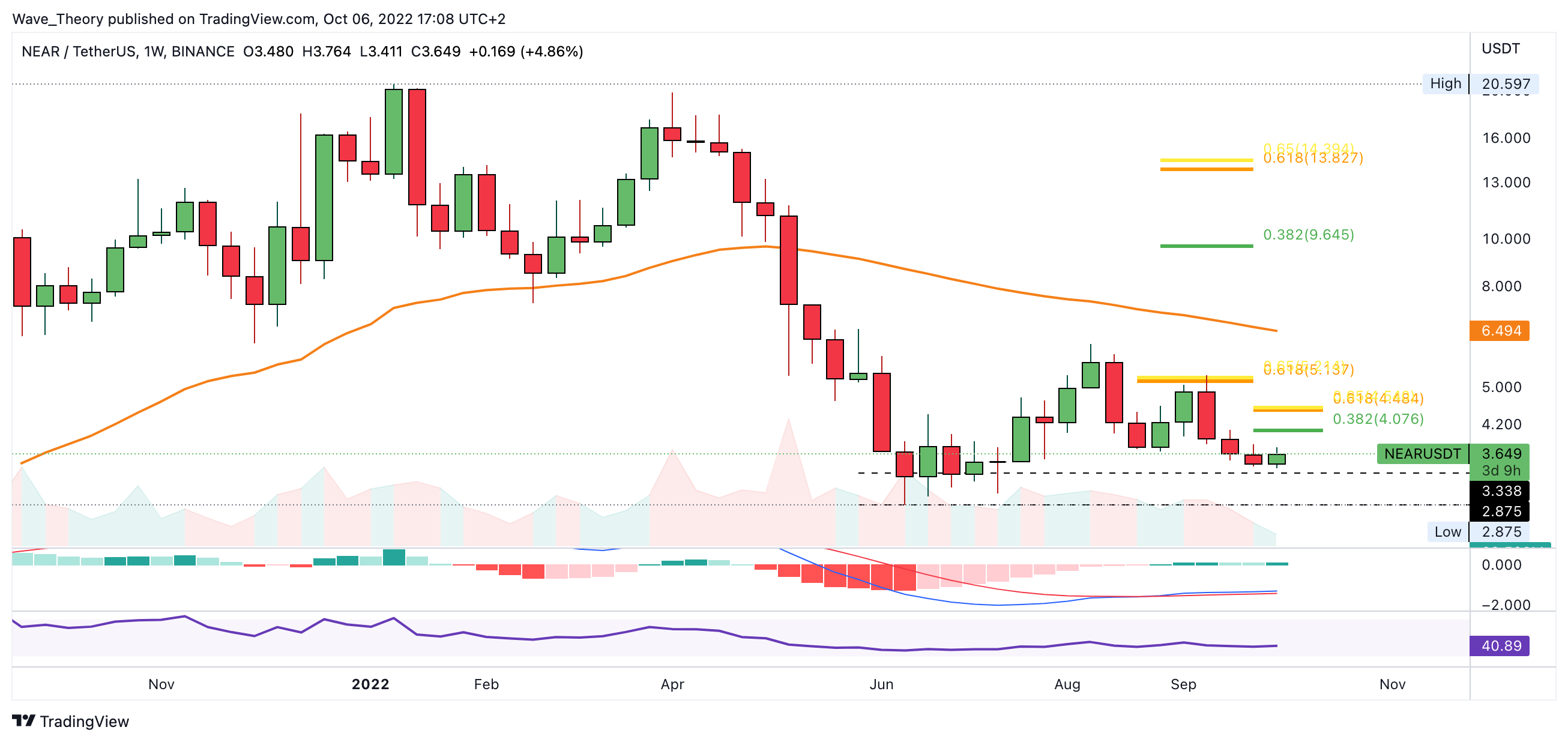 Der NEAR Kurs fiel die letzten Tage stark und setzte damit den Abwärtstrend fort. Dabei stieß der NEAR Kurs bei rund 3,4 USD auf Unterstützung und prallte nach oben ab. NEAR Protocol findet jetzt bei rund 4,075 USD den nächsten signifikanten Fib Widerstand.