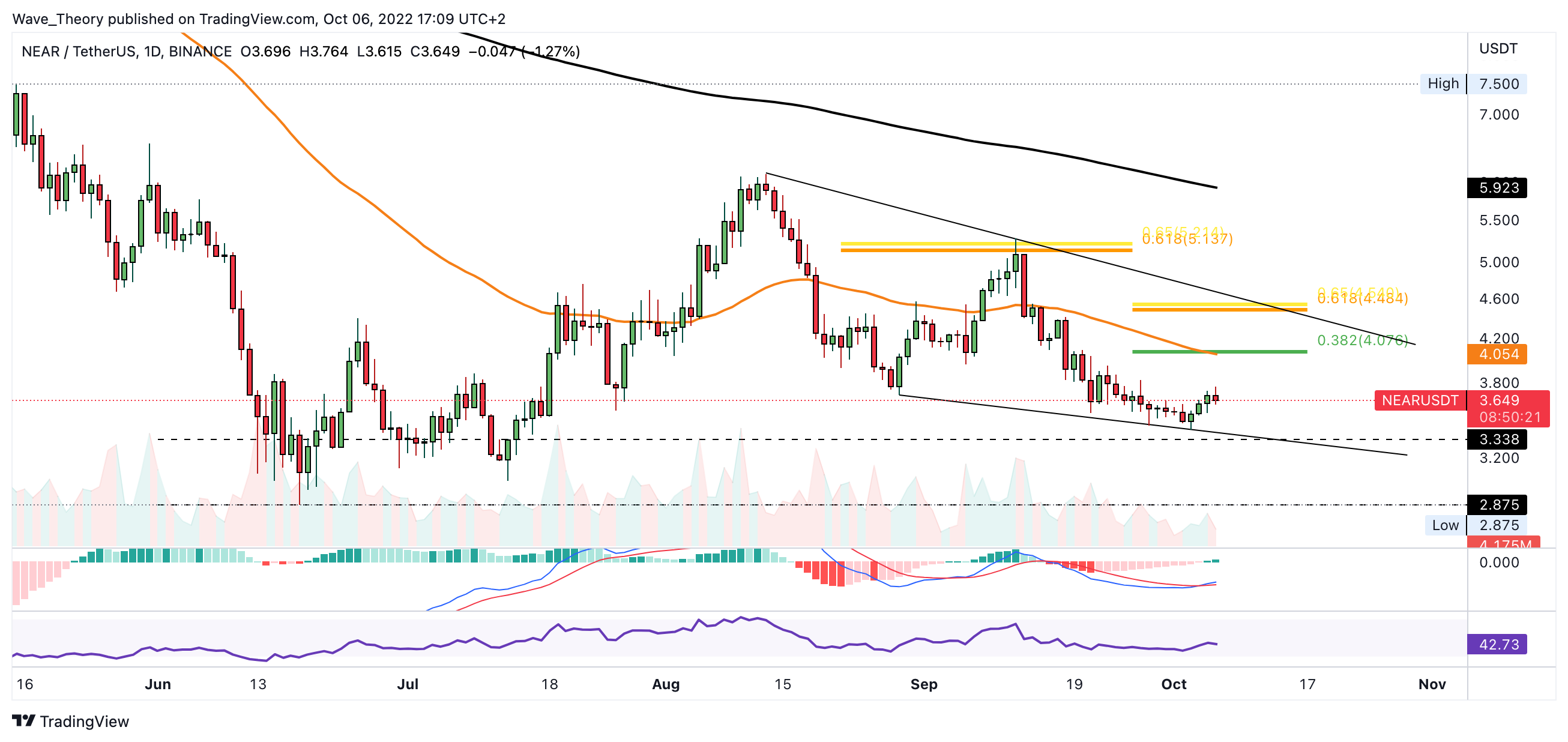 SponsoredSollte NEAR aber heute den Abwärtstrend fortsetzen, wird NEAR womöglich einen höheren Tiefpunkt formen und zwischen 2,9 USD und 3,34 USD korrigieren. Zudem tickt das Histogramm des MACDs im Tageschart bärisch tiefer und auch die MACD Linien sind bärisch überkreuzt. Währenddessen zeigt sich der RSI neutral.”