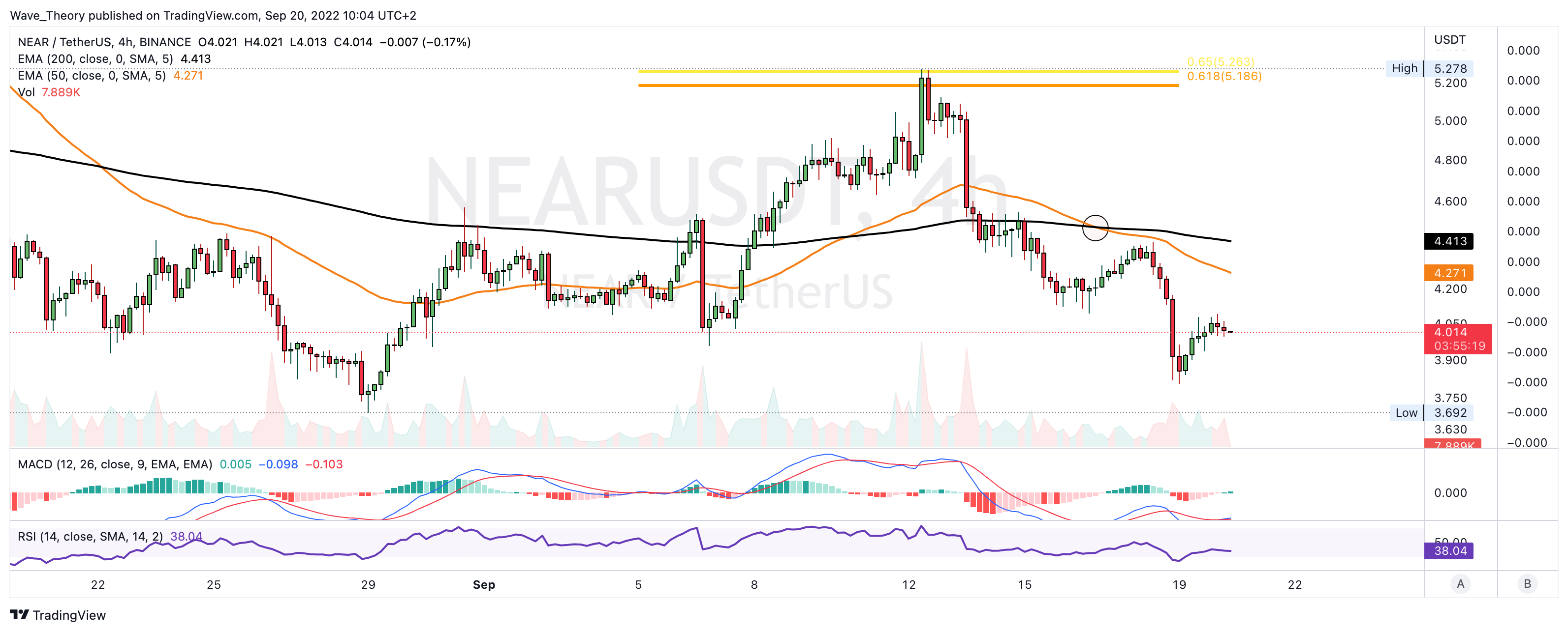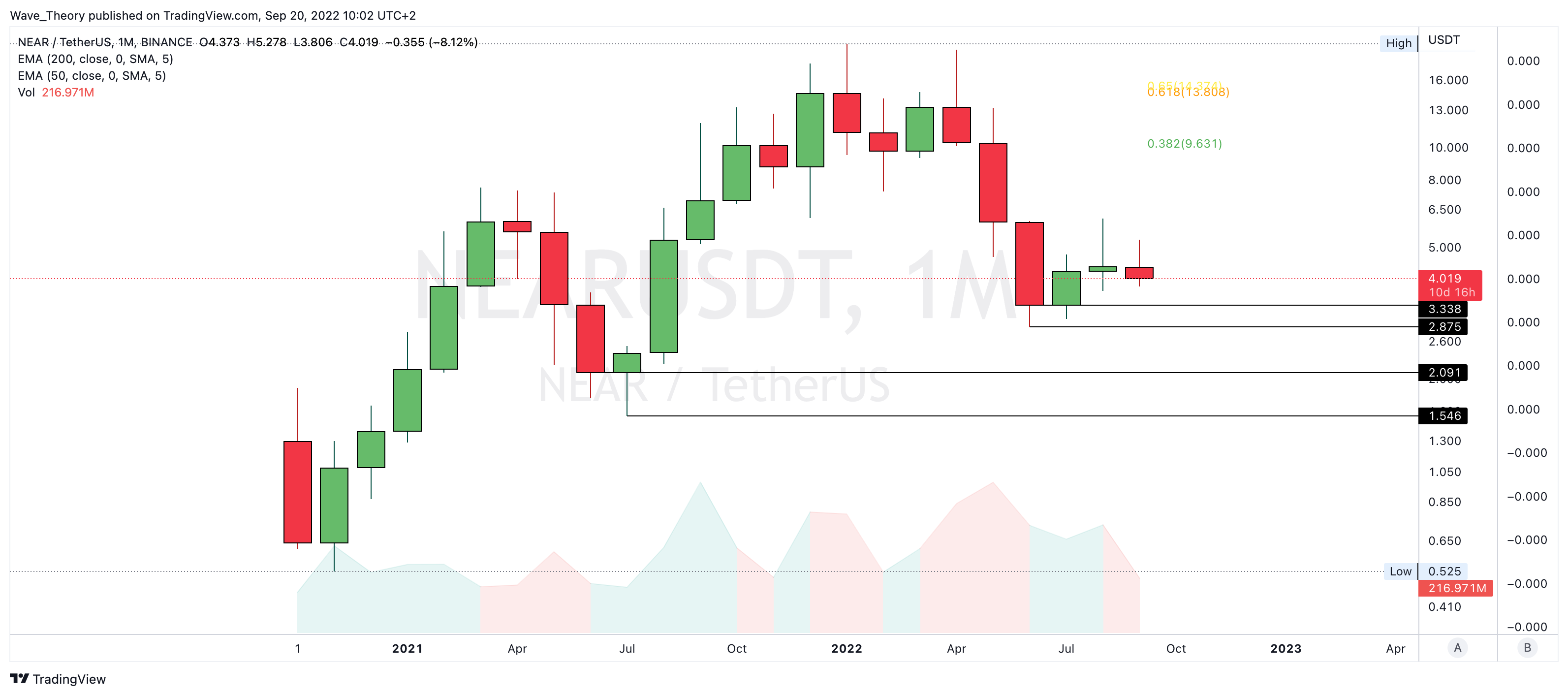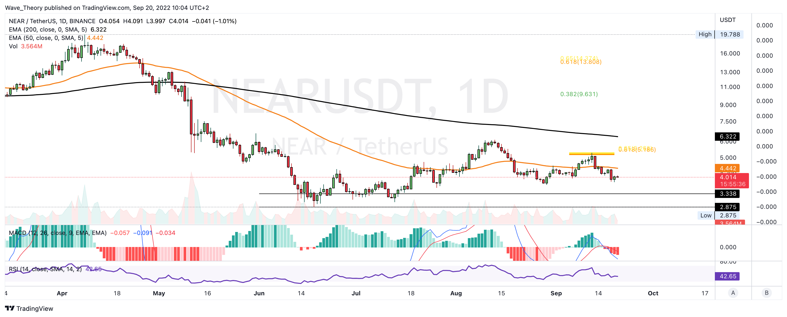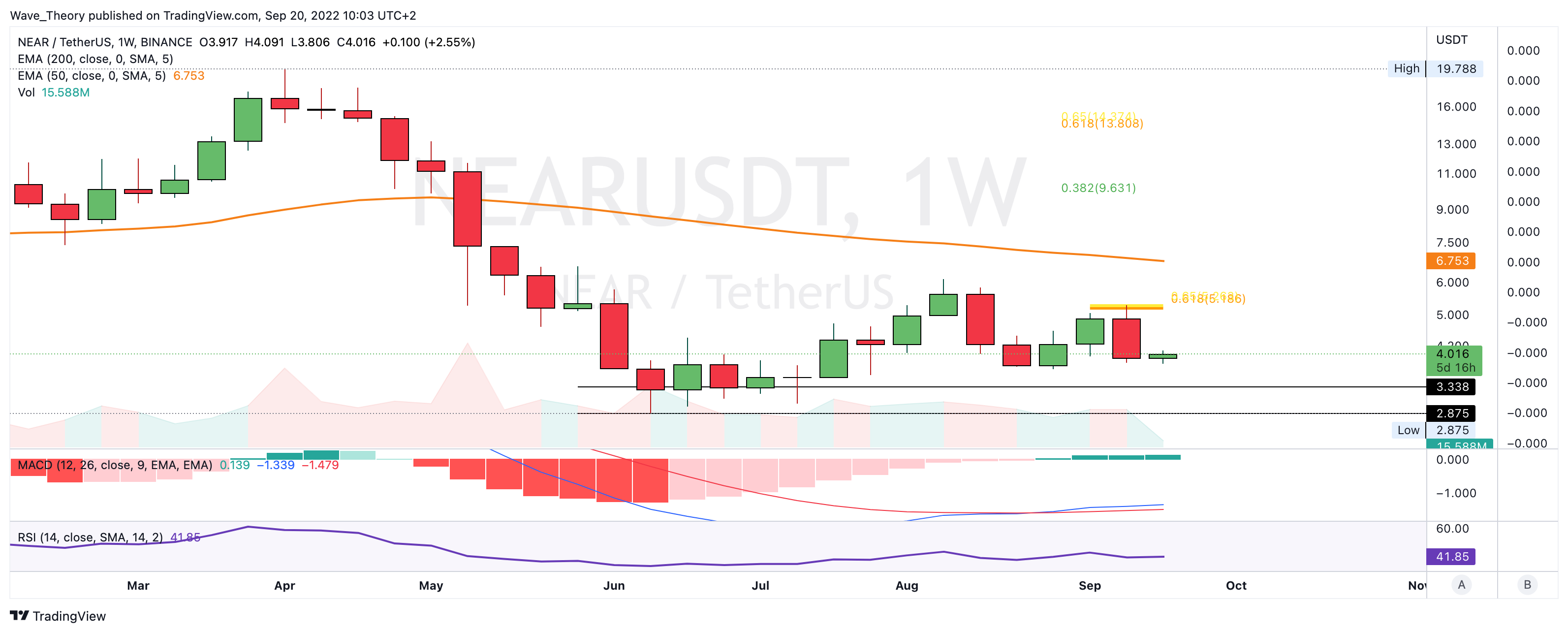Im Wochenchart formte der NEAR Kurs Ende August einen höheren Tiefpunkt bei rund 3,7 USD, was ein bullisches Zeichen ist. Jedoch formte der NEAR Kurs mit der bärischen Abweisung am Golden Ratio Widerstand bei rund 5,2 USD gleichermaßen einen tieferen Hochpunkt, was bärisch ist.