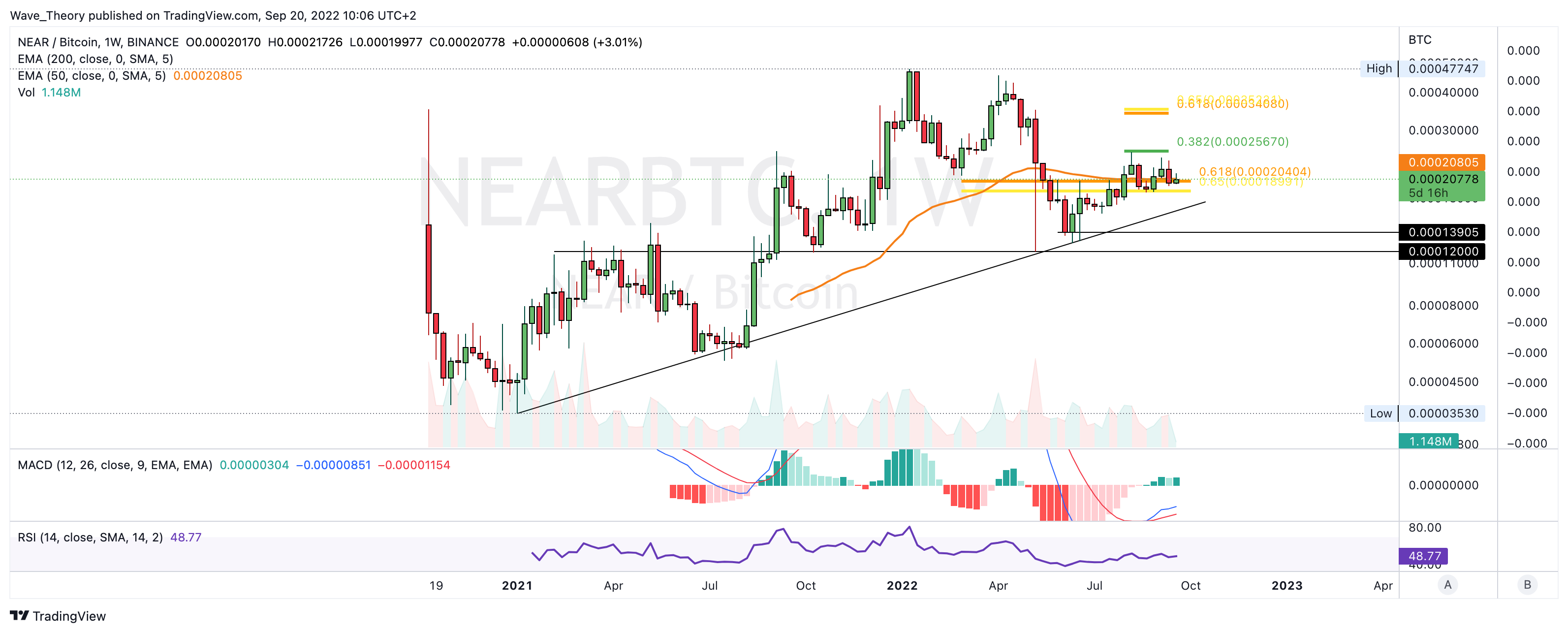 Gegen BTC befindet sich der NEAR Protocol Kurs ebenfalls seit Ende 2020 in einem starken Aufwärtstrend, aber seit 2022 in einer starken Korrekturphase. Dabei stößt der NEAR Kurs bei rund 0,000257 BTC auf signifikanten Fibonacci Widerstand. Bei einem bullischen Bruch wartet bei rund 0,00034 BTC der nächste signifikante Fib Widerstand.