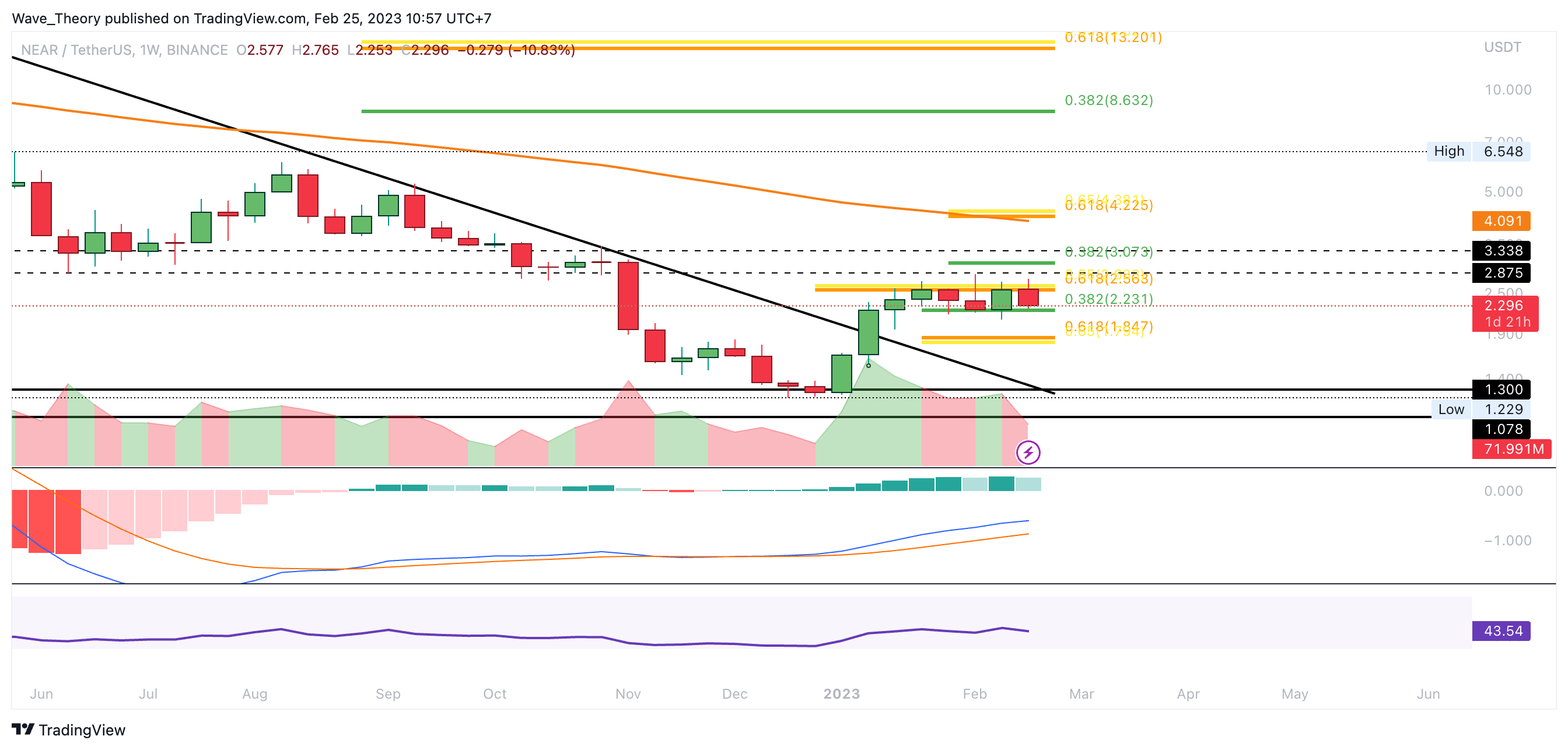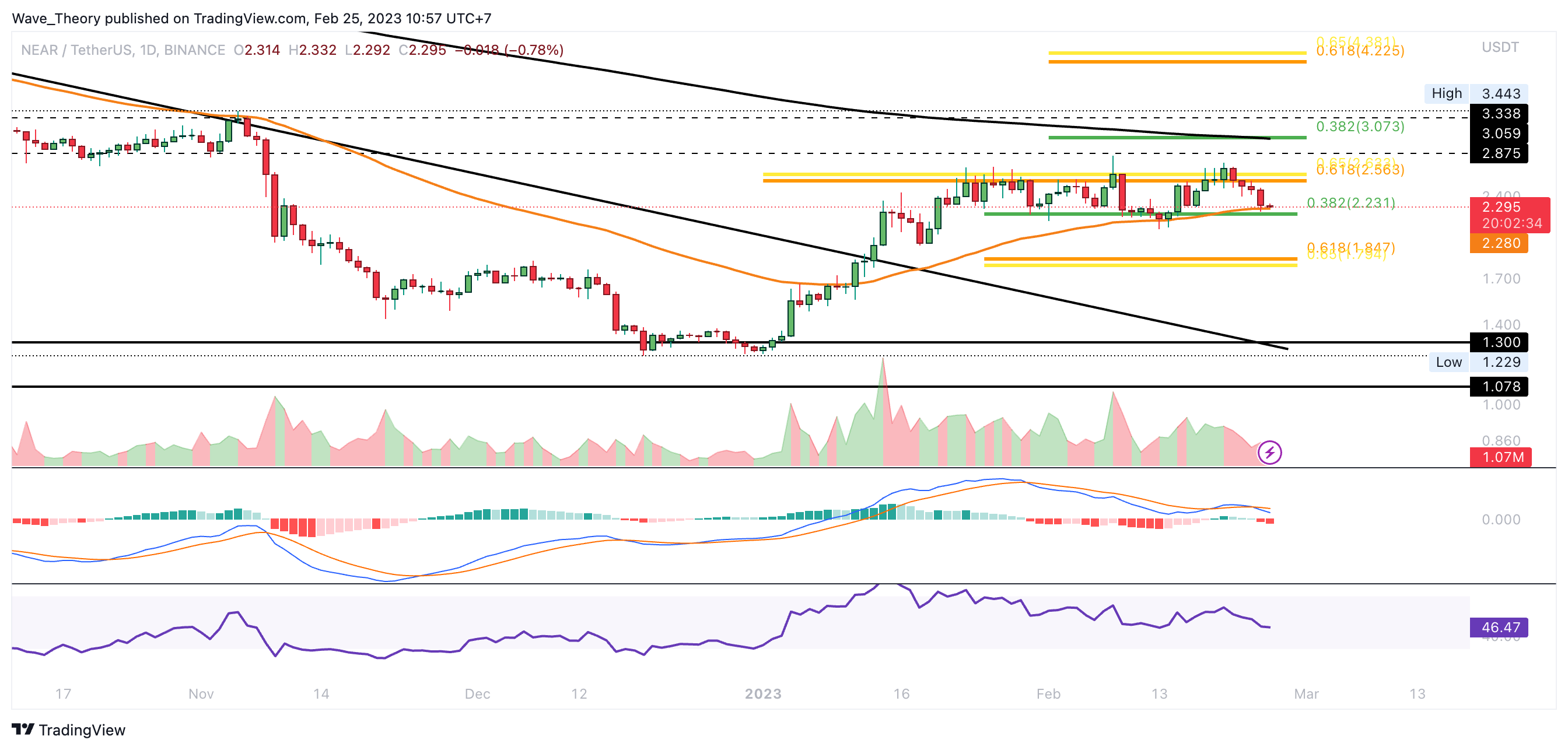 Trotz “Bullish-Engulfing-Candle” im Monatschart letzten Monat verlief der Februar bisher eindeutig bärisch für Near Protocol. Mit der bärischen Abweisung am Golden Ratio Widerstand bei rund 2,6 USD befindet sich NEAR jetzt erneut an der 0,382 Fib Unterstützung bei rund 2,23 USD.