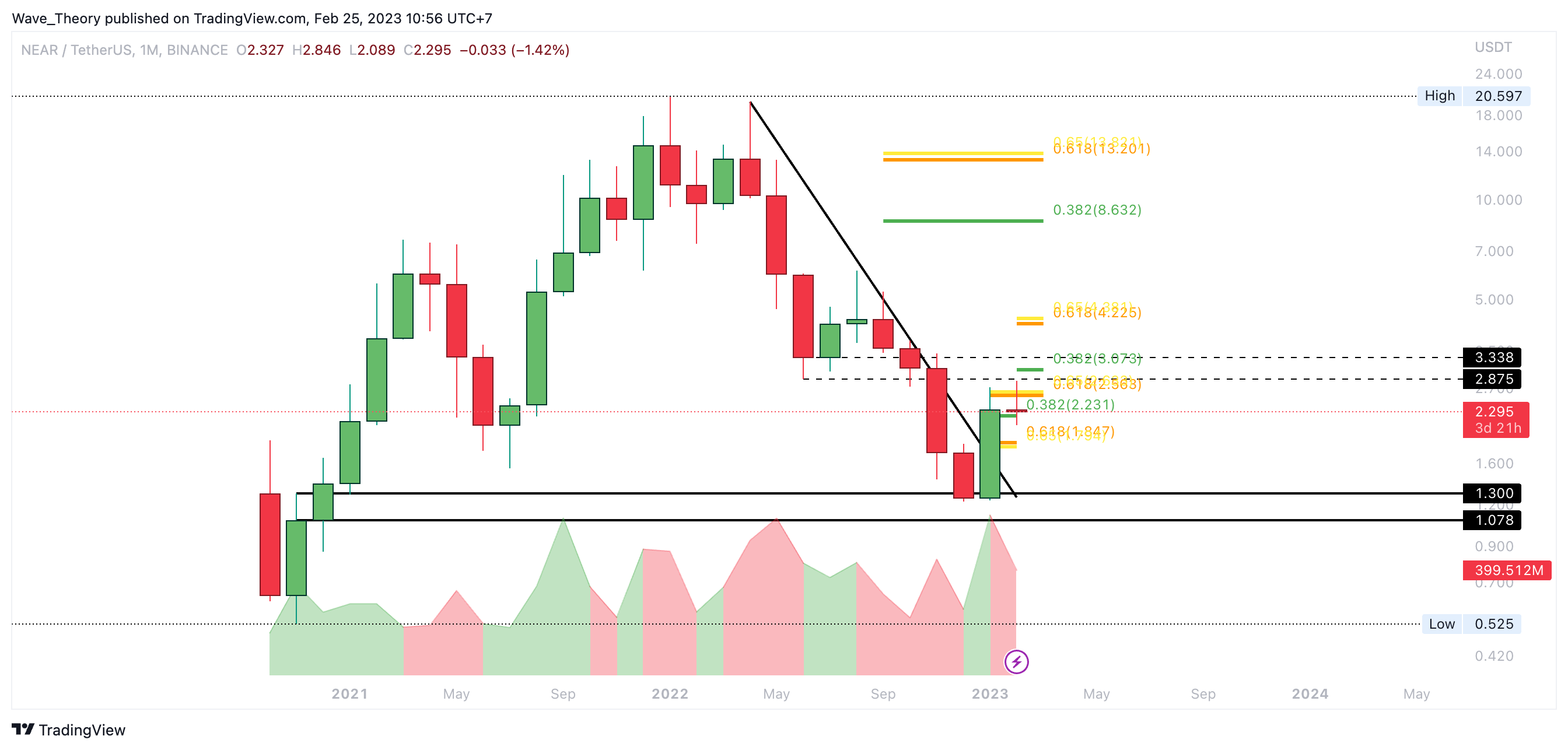 Bricht NEAR die 0,382 Fib Unterstützung bei rund 2,23 USD hingegen bärisch, wartet erst wieder bei rund 1,8 USD signifikante Fib Unterstützung auf den NEAR Kurs.