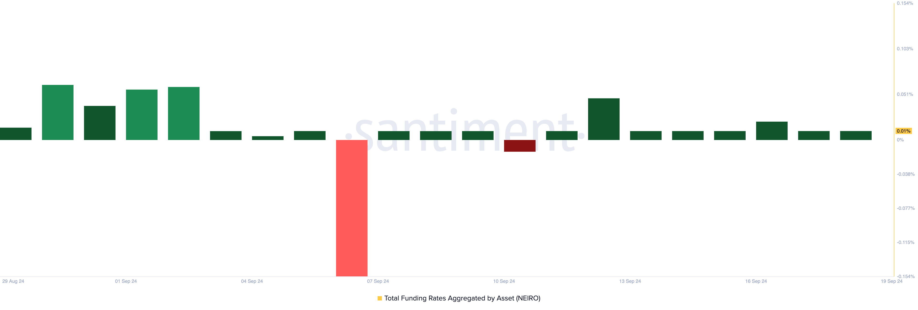 NEIRO-Händler bleiben bullisch, mit einer Finanzierungsrate des Altcoins von 0,01 Prozent, was auf eine höhere Nachfrage nach Long-Positionen unter den Teilnehmern des Futures-Marktes hindeutet.