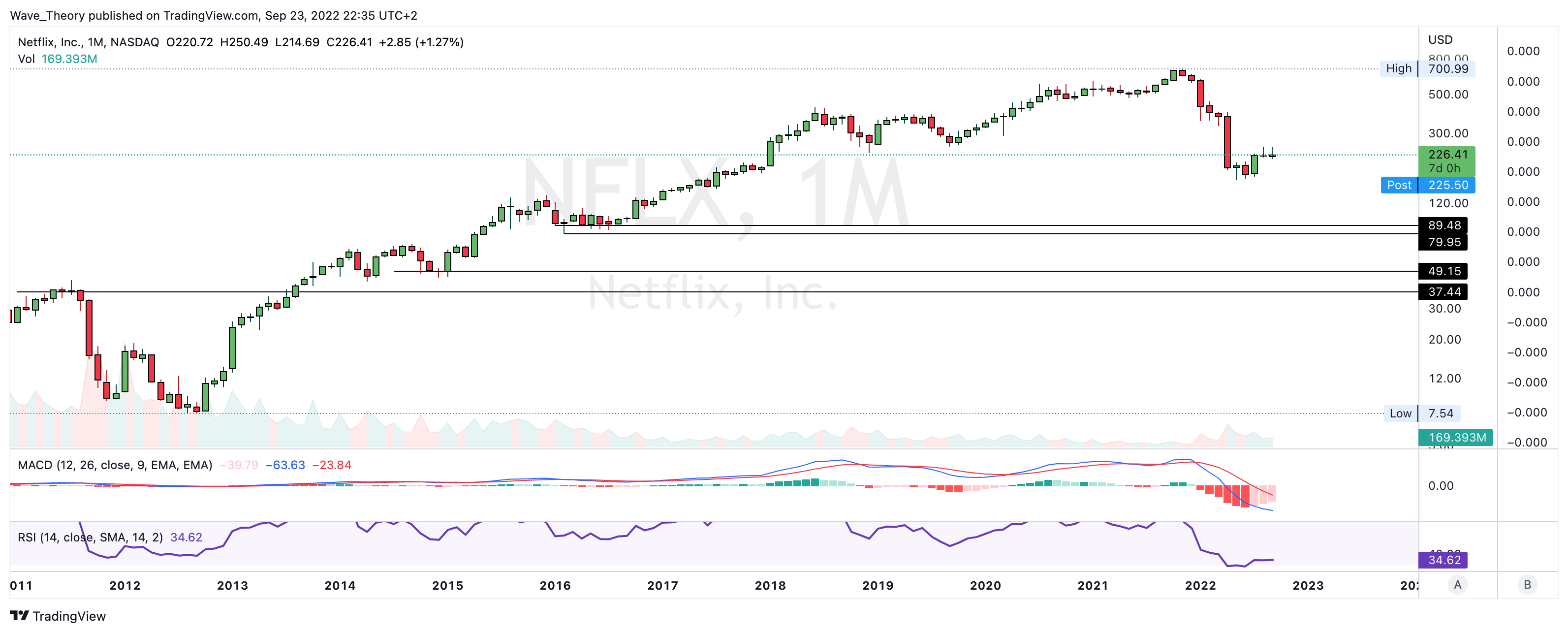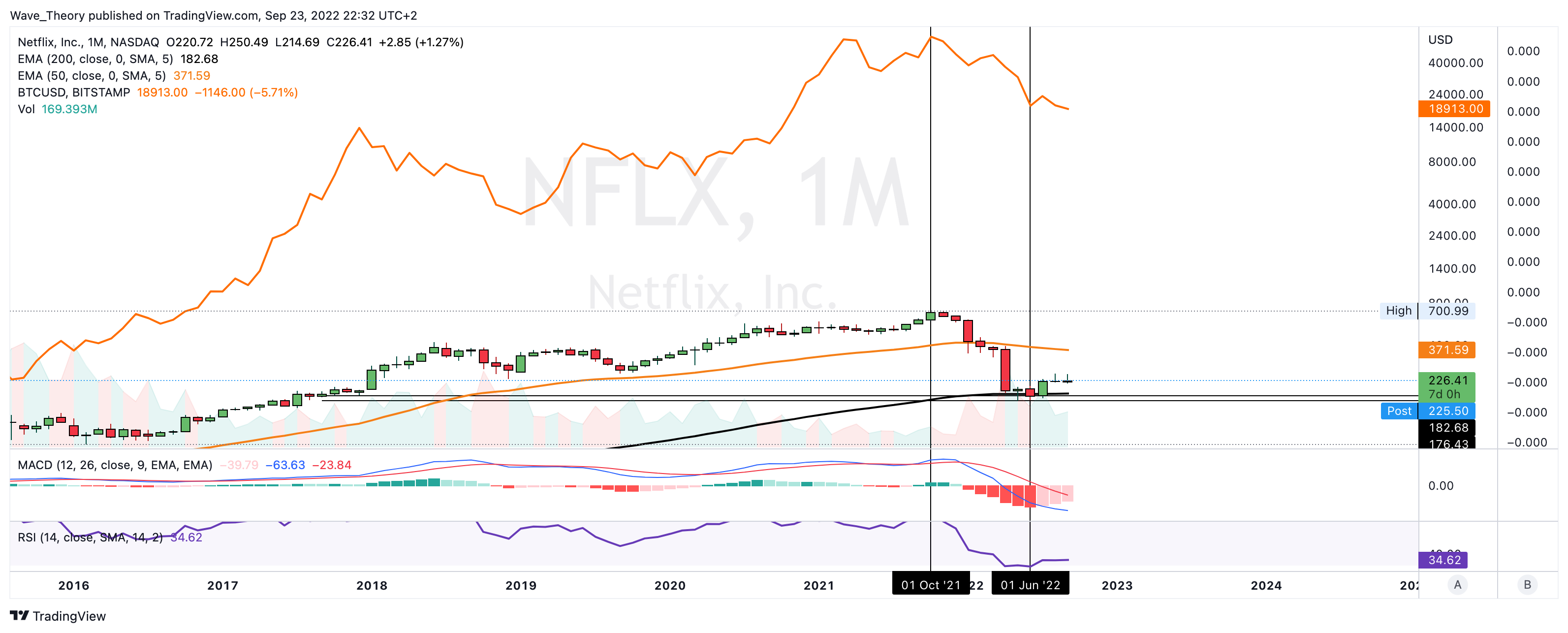 Mit rund 77 % Kursverlust fiel die Netflix Aktie sogar stärker als der Bitcoin Kurs, welcher rund 75 % gefallen ist. Dabei konnte der Netflix Kurs jetzt auf starke Unterstützung am 200-Monate-EMA bei rund 183 USD stoßen und sollte diese Unterstützung erfolgreich halten, könnte die Netflix Aktie jetzt eine Aufwärtsbewegung initiieren.