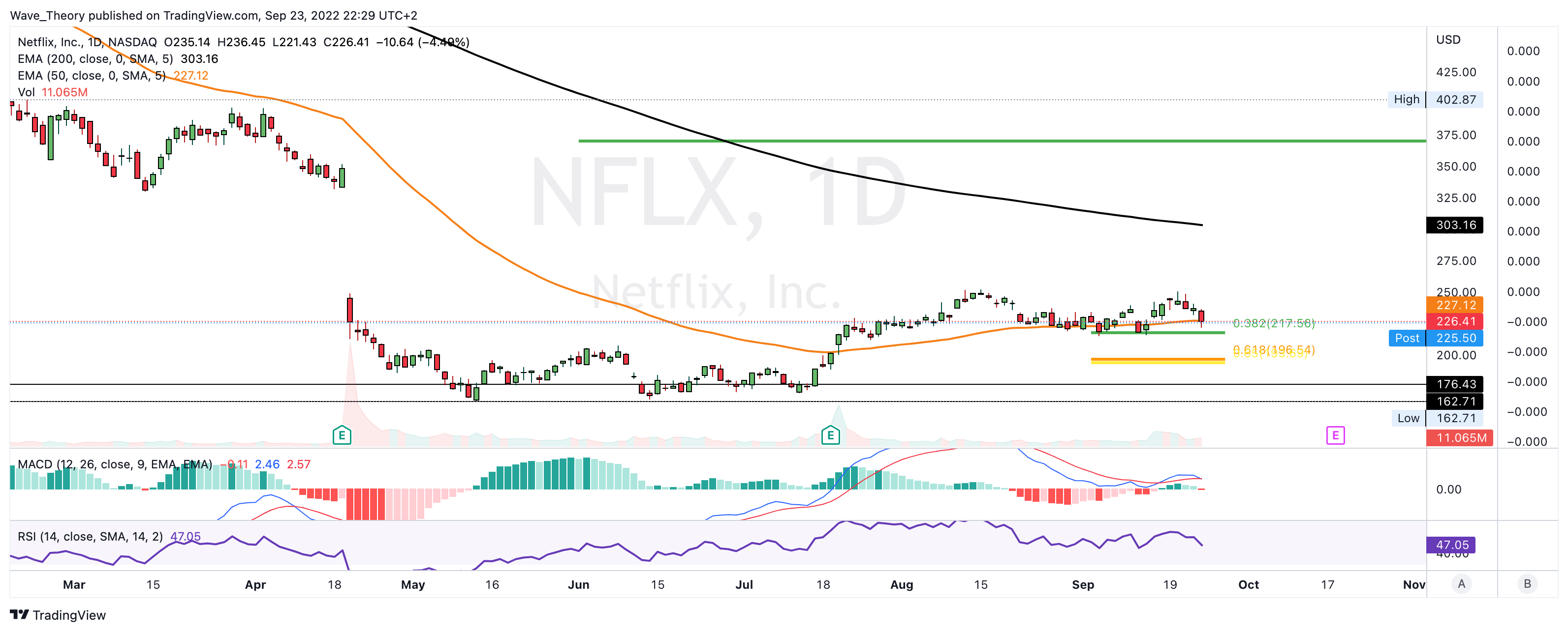 Auch im Tageschart zeigt sich der MACD eher bärisch, denn das Histogramm tickt bärisch tiefer und die MACD Linien stehen kurz vor einer bärischen Überkreuzung. Netflix findet jetzt bei rund 217,5 USD und rund 196 USD signifikante Fibonacci Unterstützungen.
