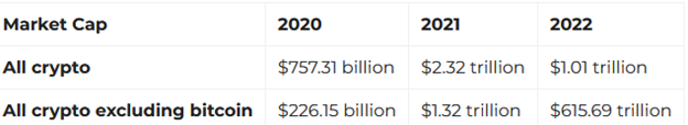 Trotz des Krypto-Winters wächst das Interesse an Krypto-Investitionen weiter. Die Marktkapitalisierung des Kryptomarktes ist von 2020 bis 2022 sogar exponentiell gewachsen.