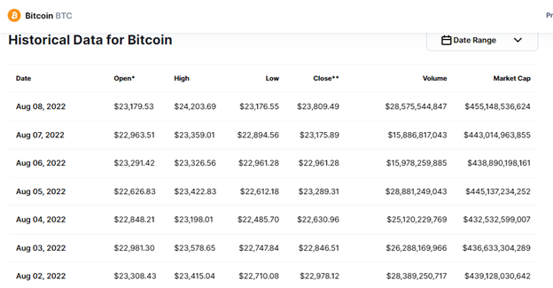 Hier können Anleger die Bitcoin-Preise in verschiedenen Zeiträumen analysieren. Außerdem kannst du den Marktpreis zum Öffnungszeitpunkt, den höheren und niedrigeren Preis sowie den Kurs zur Schließung an verschiedenen Tagen analysieren.