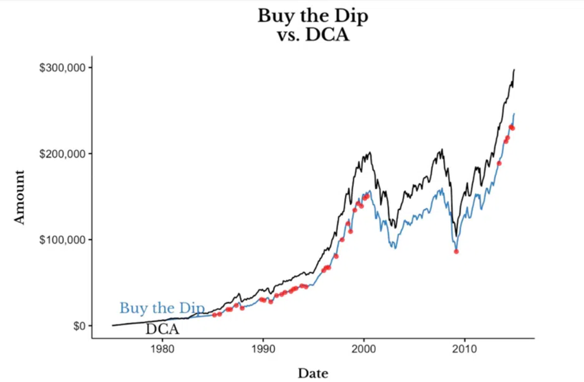 “Buy the Dip” (blaue Linie) bedeutet, immer dann zu kaufen, wenn der Kurs fällt. Diese Kaufzeitpunkte werden durch die roten Punkte auf der blauen Linie signalisiert. DCA (Dollar-Cost-Averaging) bedeutet hingegen, regelmäßig zu kaufen, unabhängig vom Preis.