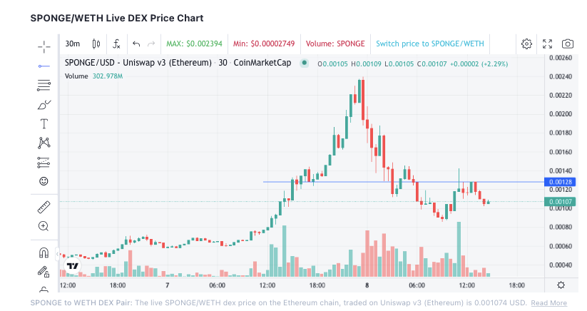 Mit einem Handelsvolumen von über 100 Millionen USD in den letzten 24 Stunden und einer hohen Liquidität ist SPONGE wie gemacht für das Trading von Meme-Coins. Übrigens katapultierte dieses Volumen den SpongeBob Token auf Platz 6 im entsprechenden Ranking. Noch vor dem FLOKI Coin, der erst in der vergangenen Woche eine Notierung bei der umsatzstärksten Krypto-Börse Binance erhielt.