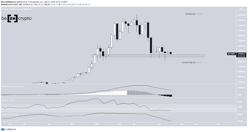 Der Bitcoin Preis ist in der letzten Woche etwas gefallen. Das Wochentief lag bei 32.077 USD. Der Bitcoin Kurs ist nach diesem jedoch wieder angestiegen. Der Wochenschlusskurs lag bei 34.258 USD. Seit dem 19. Mai 2021 wurde der Bitcoin Preis über dem horizontalen Support-Level bei 32.400 USD gehandelt. Es gibt zwar einige längere Wicks in diesem Bereich zu sehen, allerdings gab es bis jetzt keinen Wochenschlusskurs unter diesem Bereich.