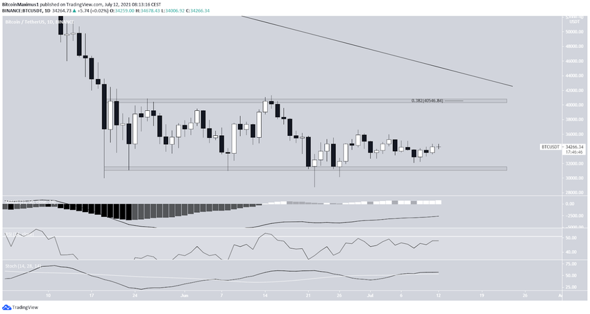Auf dem Tageschart siehst du, dass der Bitcoin Preis seit dem 19. Mai 2021 zwischen 31.300 USD und 40.550 USD gehandelt wird. Der Bitcoin Kurs ist am 22. Juni 2021 von dem unten gezeigten Support-Level abgeprallt und seit dem wieder weiter angestiegen.