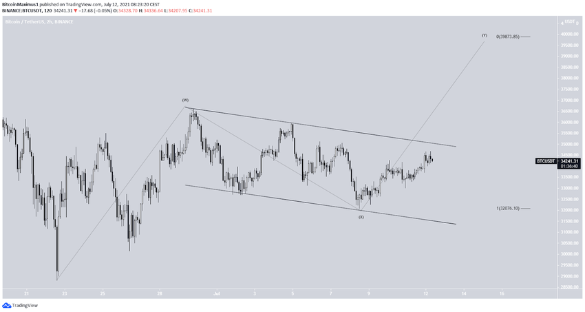 Der Bitcoin Kurs befindet sich wahrscheinlich gerade innerhalb einer komplexen W-X-Y-Struktur. Falls die Wellenzählung korrekt ist, dann befindet sich der BTC Kurs gerade in der Y-Welle. Sollten die W und die Y Welle ein 1:1 Verhältnis aufweisen, dann wird der Bitcoin Preis wohl auf ein neues Hoch ansteigen, dass sich in der Nähe von 40.000 USD bzw. der oberen Grenze des zuvor erwähnten Preisbereichs ansteigen.