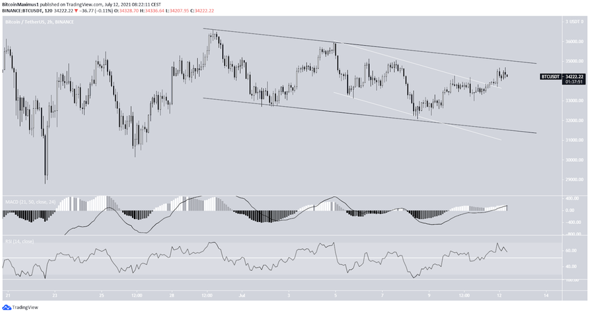 Auf dem 2-Stunden-Bitcoin-Chart siehst du, dass der Bitcoin Preis seit dem 29. Juni 2021 innerhalb eines absteigenden, parallelen Channels gehandelt wird (schwarz). Der Bitcoin Kurs ist zudem aus einem kleineren absteigenden Channel ausgebrochen (in weiß eingezeichnet). Sowohl der RSI als auch der MACD sehen bullisch aus und steigen an. Deswegen wird der BTC Kurs wohl aus dem größeren Channel ausbrechen.