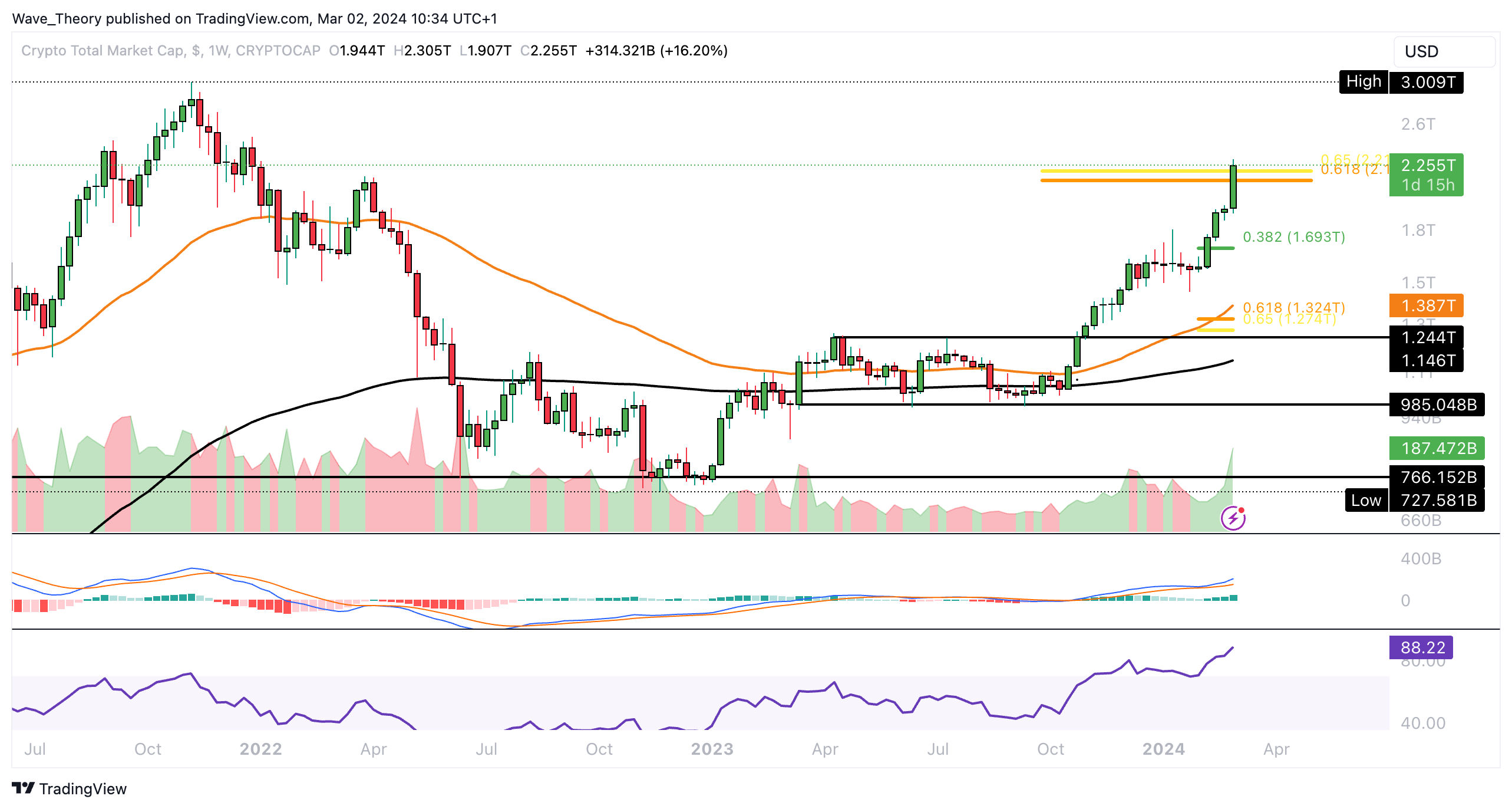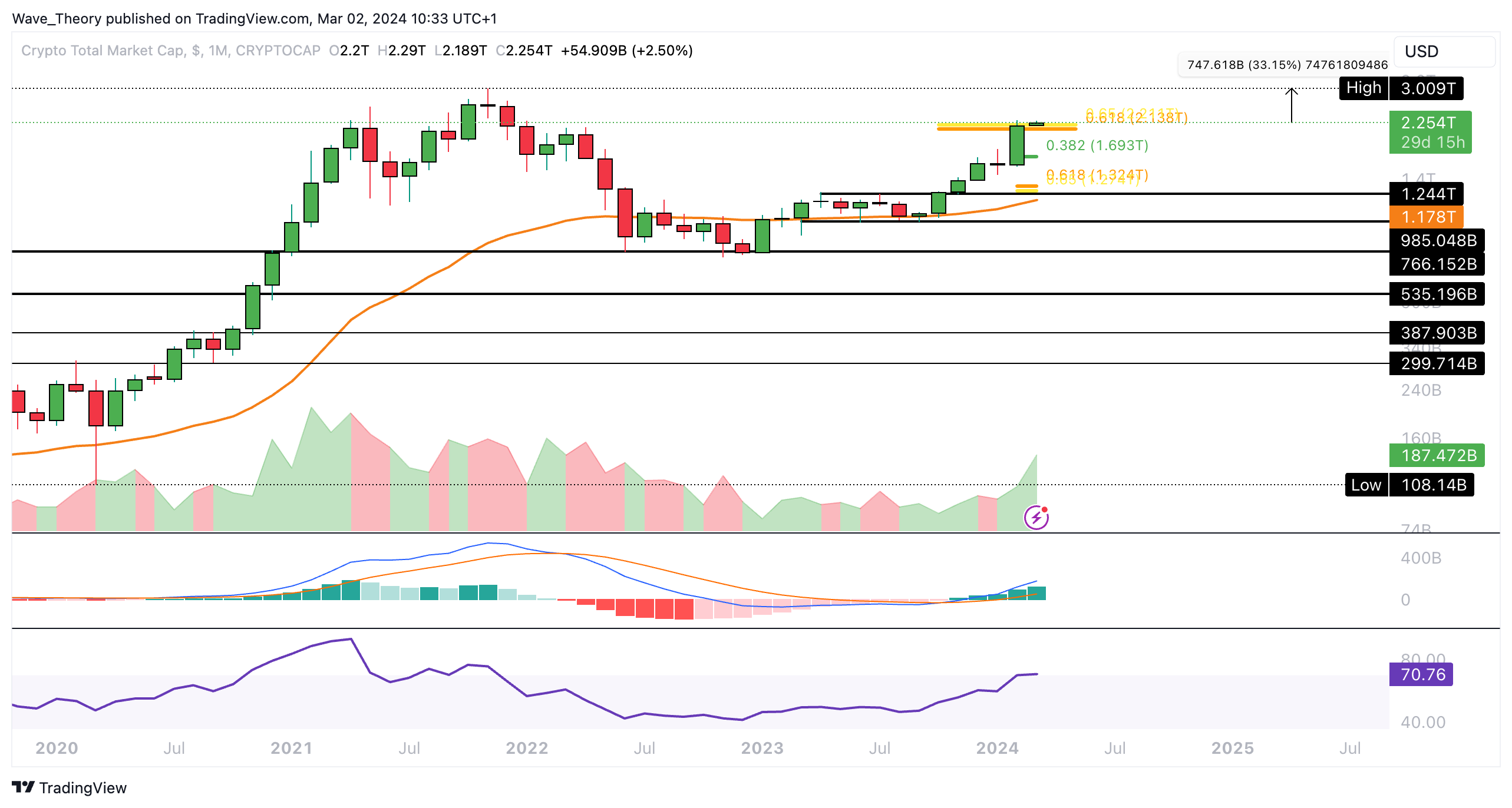 Sollte der Markt jetzt am Golden Ratio Niveau bei rund 2,2 Billionen USD auf bärische Ablehnung stoßen, warten bei rund 1,69 Billionen USD und bei rund 1,3 Billionen USD die nächsten signifikanten Fib Unterstützungen.