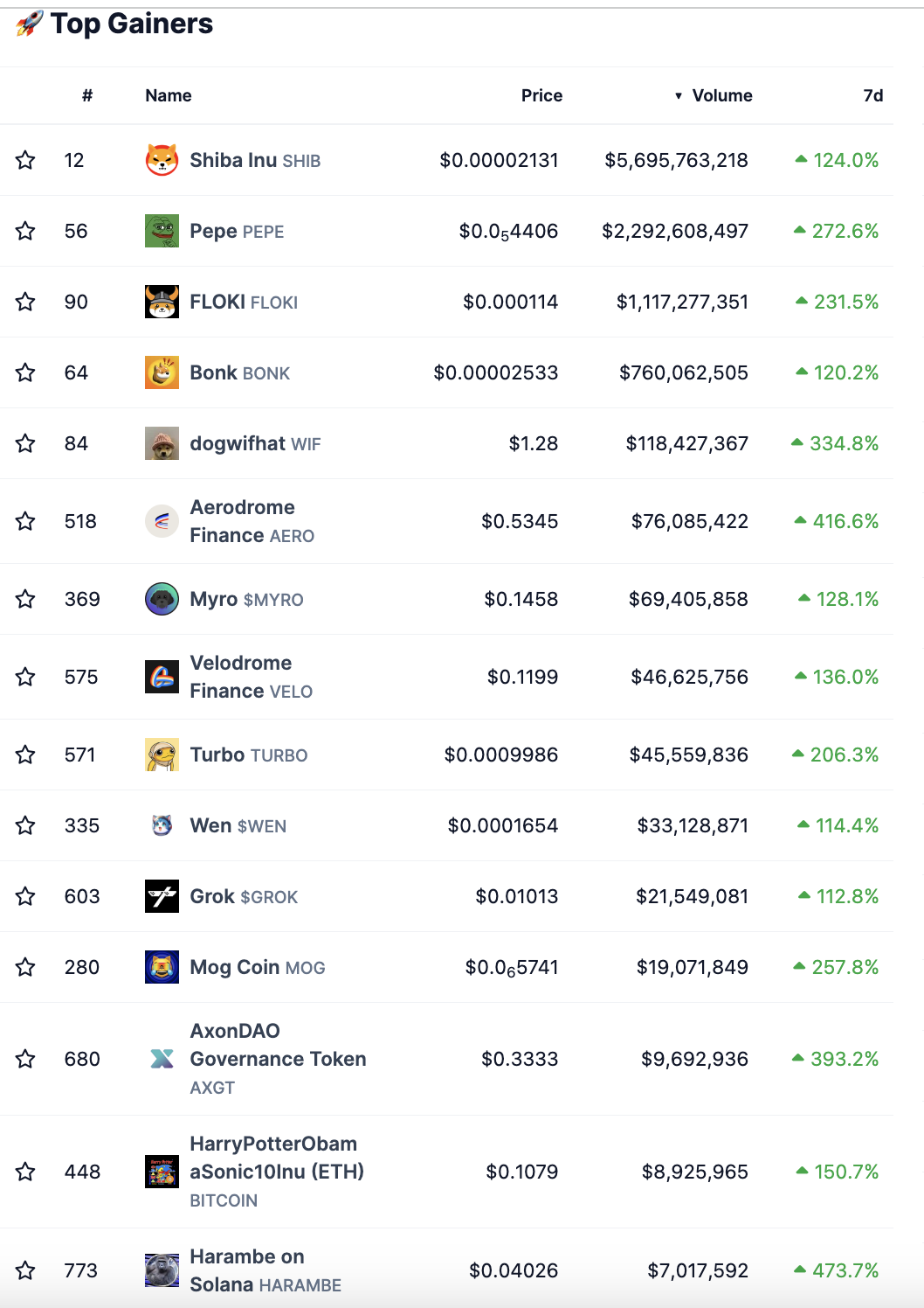 In den letzten sieben Tagen dominieren die Memecoins auf dem Krypto-Markt
