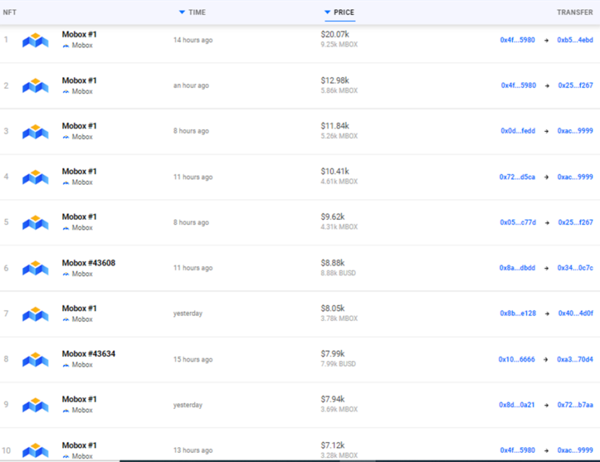 Die oben genannten sind die vier mit dem größten Umsatzvolumen auf der BSC. Die 10 umsatzstärksten NFTs stammen dabei von Mobox collectibles. Mobox, das zu MOMOverse gehört, ist eine Spieleplattform, die eine Kombination aus NFTs und Yield Farming nutzt, um ein kostenloses Play-to-Earn-Ökosystem zu schaffen.