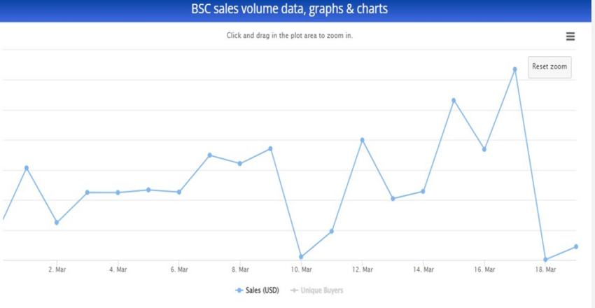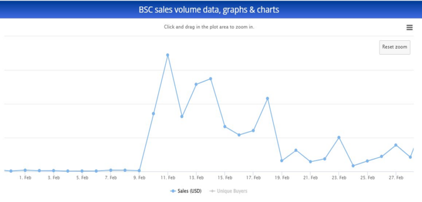 SponsoredBSC NFTs gewannen im Februar 2021 an Bedeutung, dem ersten Monat, in dem die Aktivität nicht-fungibler Token von CryptoSlam verfolgt wurde. Im Februar 2021 belief sich die Gesamtzahl der einzigartigen Käufer auf gerade einmal 142. Somit ist die Gesamtzahl der individuellen Käufer im März 2022 um 1.150% höher als die Anzahl der individuellen Käufer, die im ersten Monat des BSC NFT-Daten-Tracking aufgezeichnet wurde. Aktuell liegt das tägliche NFT-Handelsvolumen bei rund 50.000 USD.