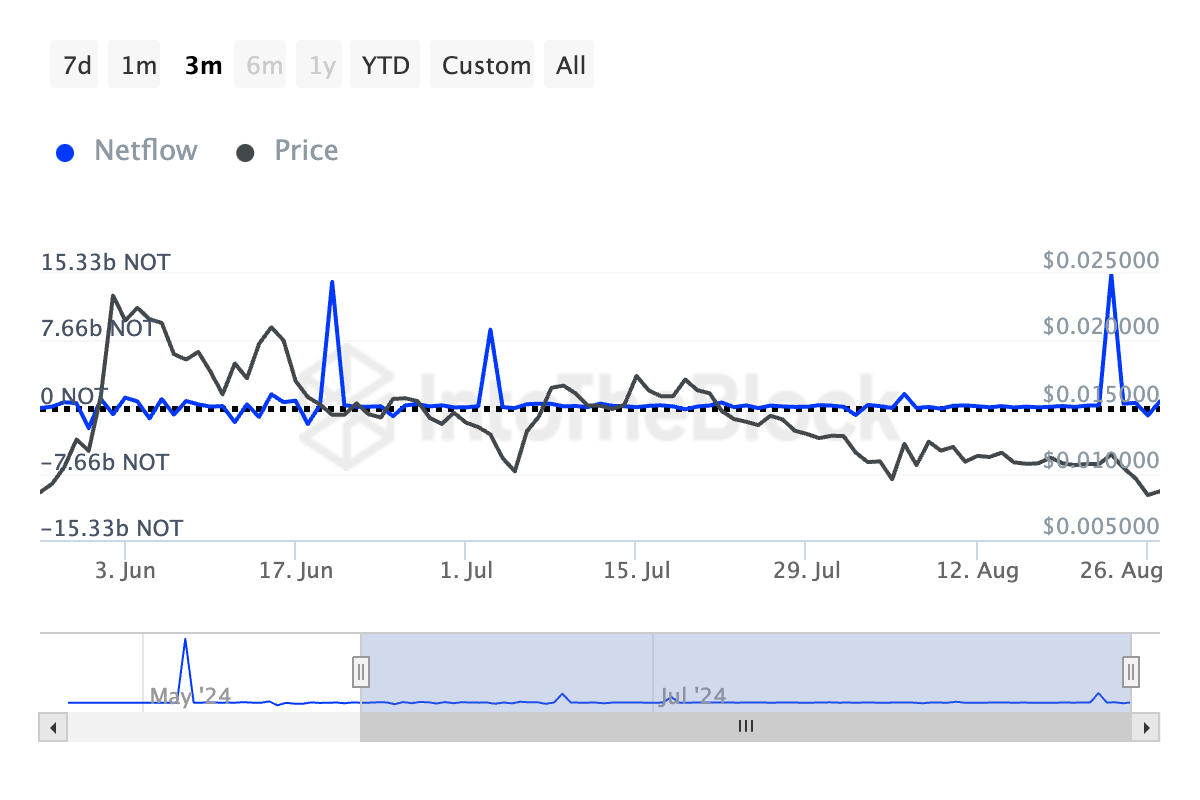 Interessanterweise haben trotz dieses Rückgangs die NOT-Wale die Situation genutzt, um ihre Ansammlung zu erhöhen. Der Nettofluss der großen Halter ist in den letzten sieben Tagen um 312 Prozent gestiegen. Zum Vergleich: Diese Metrik erreichte am 24. August, nach der Nachricht von Durovs Verhaftung, ein Dreimonatshoch von 15,33 Milliarden NOT, was die Kurse von Telegram-basierten Vermögenswerten zum Sturz brachte.