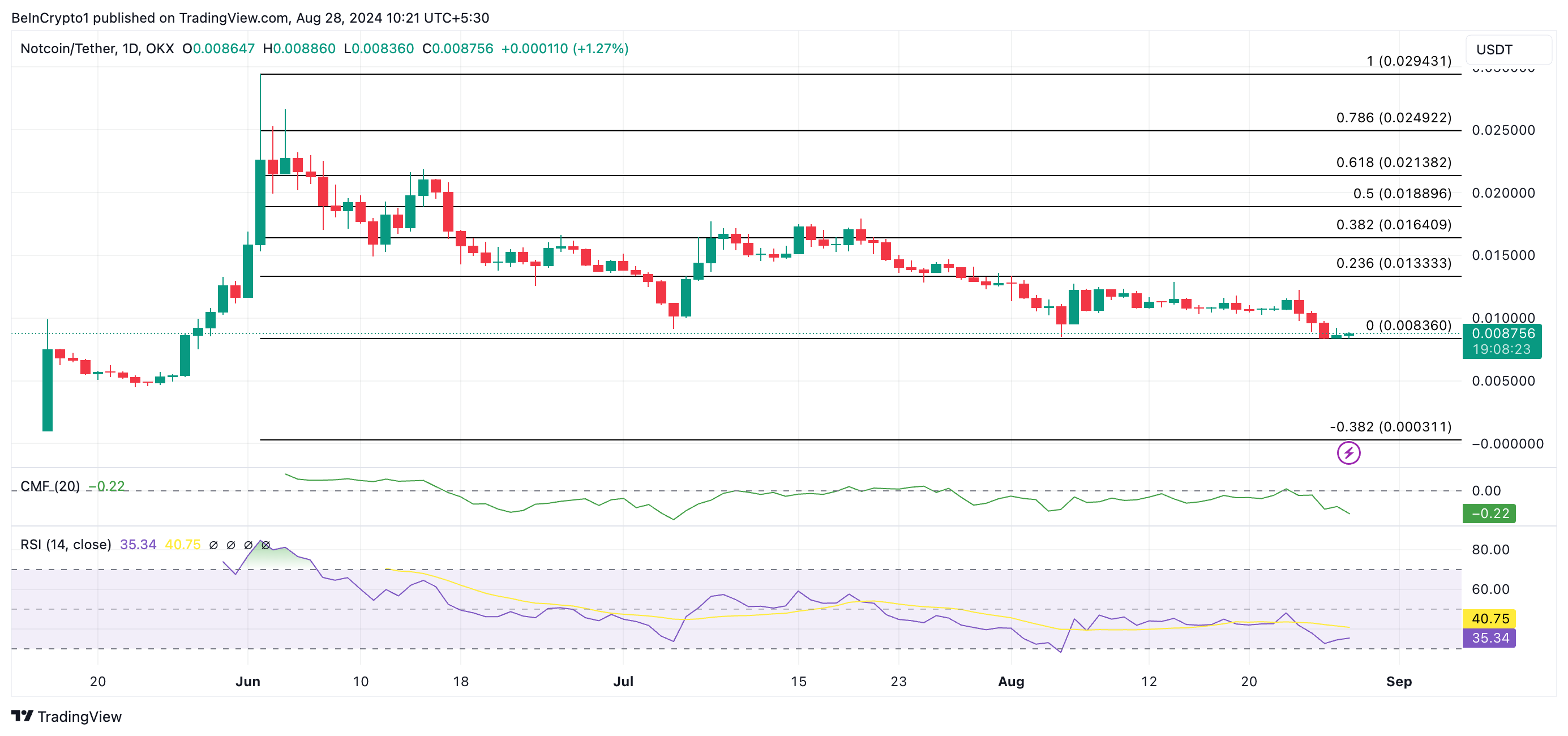 Mit steigendem Verkaufsdruck könnte NOT auf sein Allzeittief von 0,0046 USD fallen, zuletzt verzeichnet am 24. Mai.