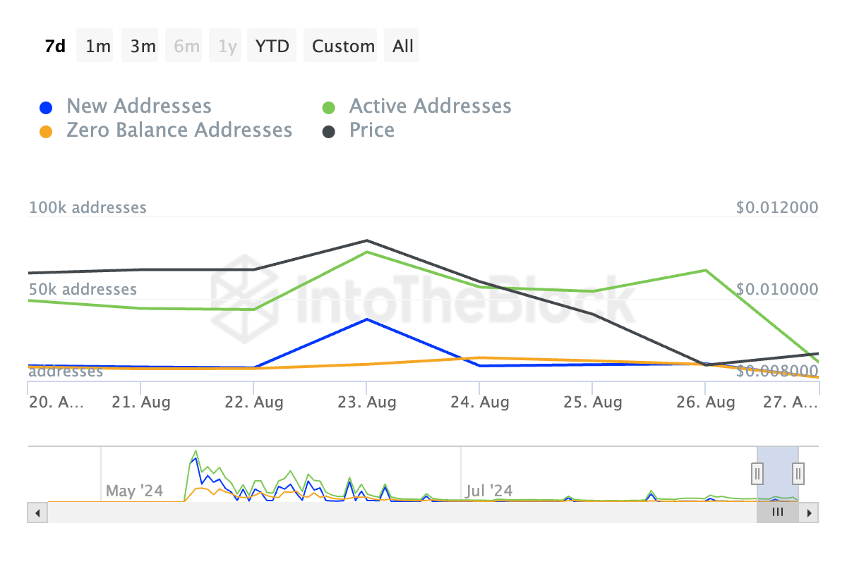 Aufgrund der jüngsten Kursprobleme von NOT ist die Zahl der aktiven Adressen, die den Altcoin handeln, in den letzten sieben Tagen stetig gesunken. Daten von IntoTheBlock zeigen einen Rückgang um 76 Prozent bei einzigartigen Adressen, die mindestens eine NOT-Transaktion in diesem Zeitraum abgeschlossen haben.