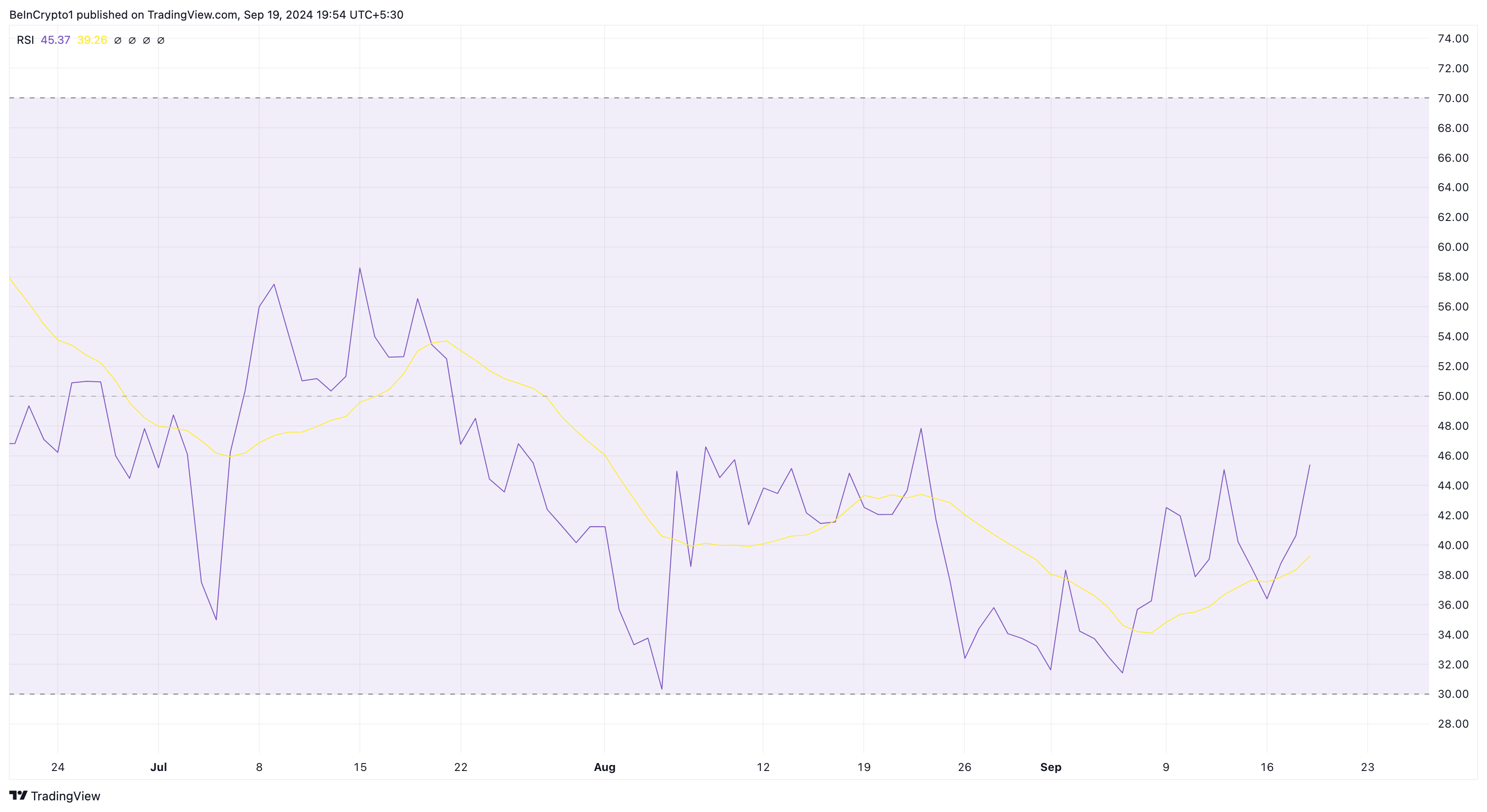 Eine Bewertung von Notcoin im Tageszeitrahmen zeigt, dass sein Relative Strength Index (RSI) weiterhin unter der neutralen Marke von 50,00 liegt. Der RSI ist ein Momentum-Indikator, der die Geschwindigkeit und Größe von Kursänderungen verfolgt.