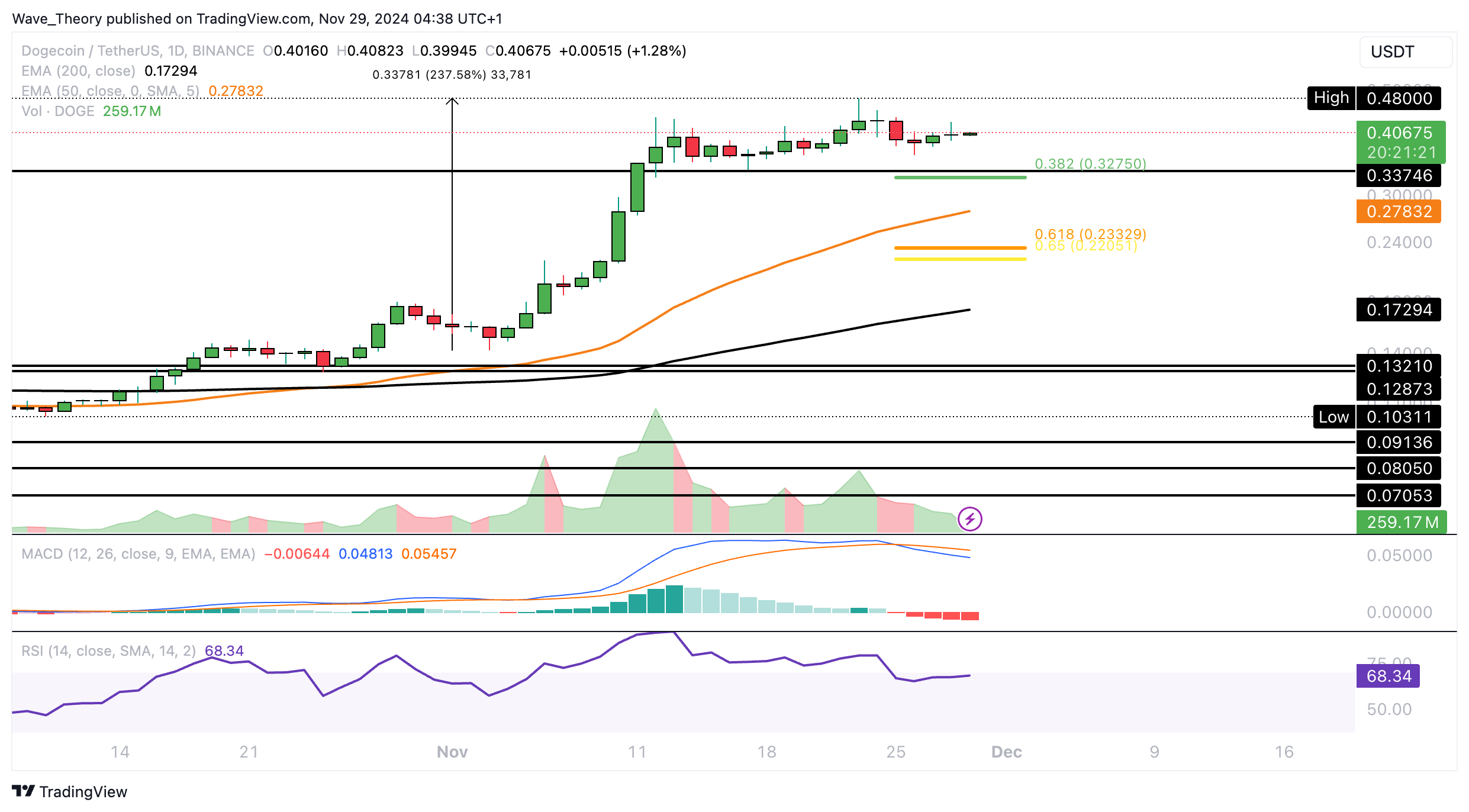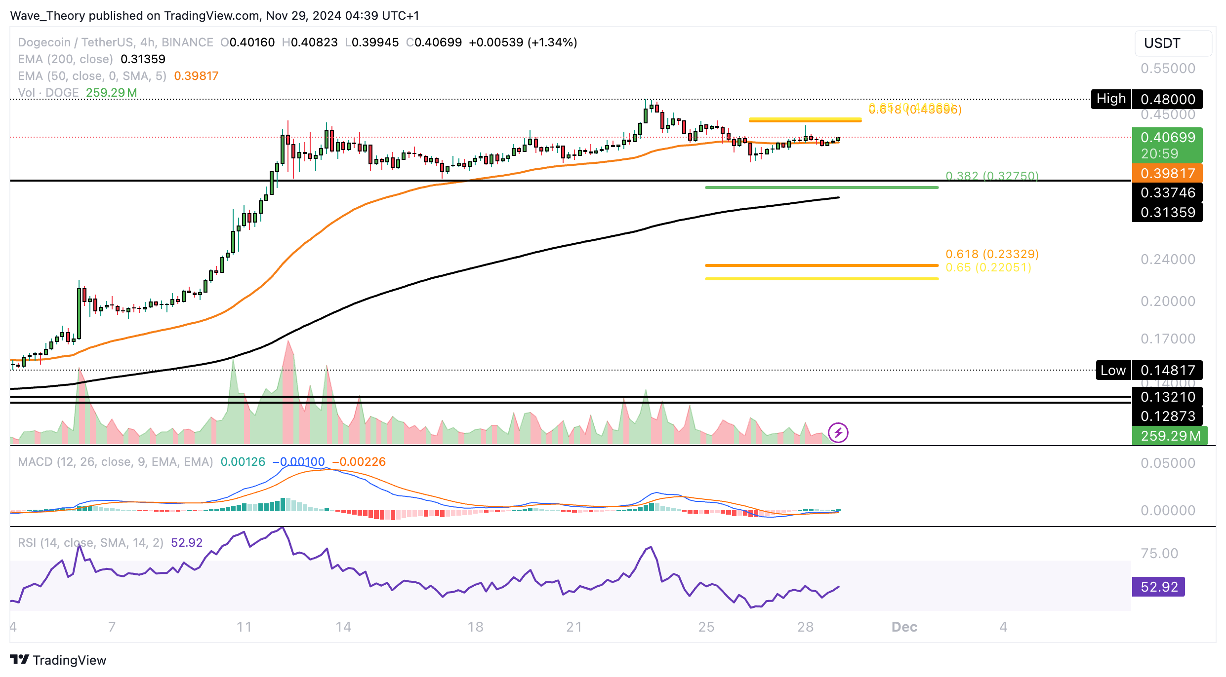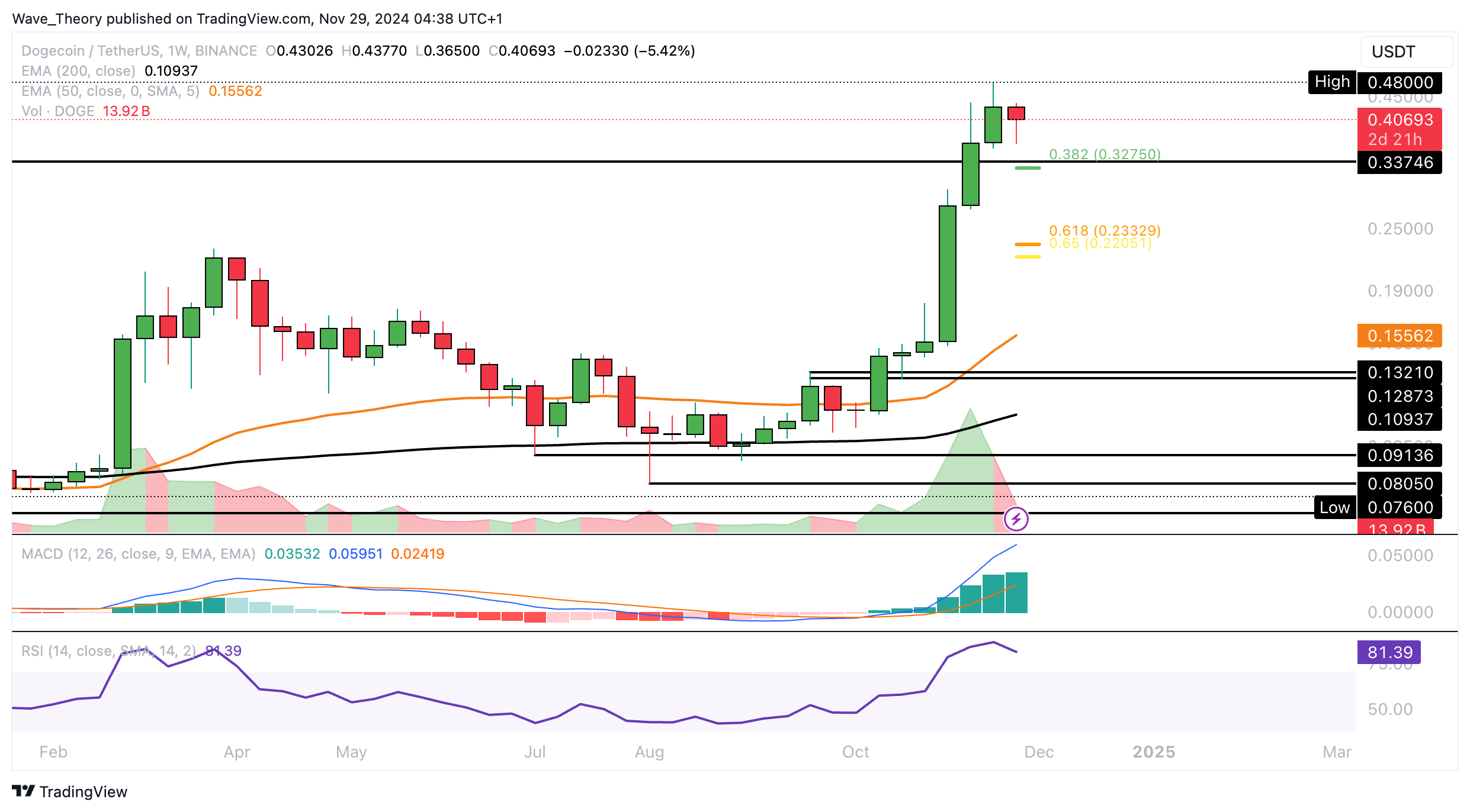 Mit einem Bruch der Golden Ratio bei rund 0,44 USD ist die Korrekturbewegung beendet. Dann könnte Dogecoin das letzte Hoch bei rund 0,48 USD anvisieren oder gar übersteigen.
