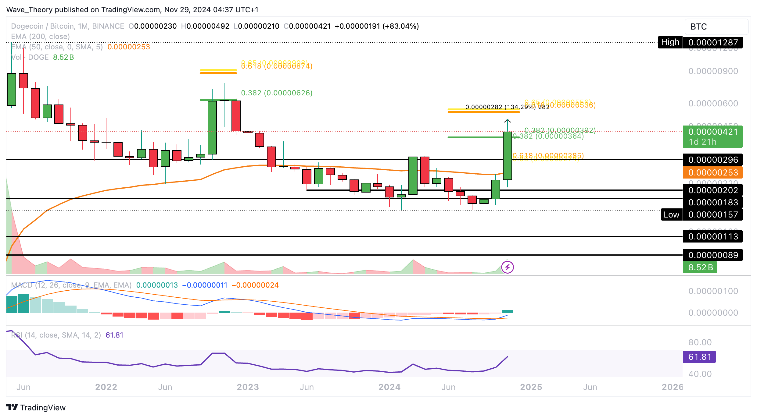 Gegen Bitcoin hat Dogecoin den 0,382 Fib Widerstand bei rund 0,00000392 BTC kurzfristig übertroffen. Jedoch läuft Dogecoin Gefahr, in diesem Monat darunter zu schließen.