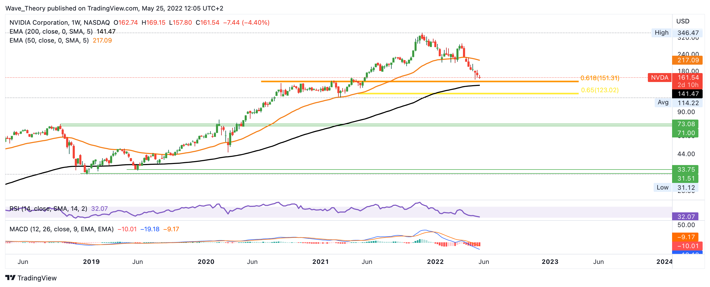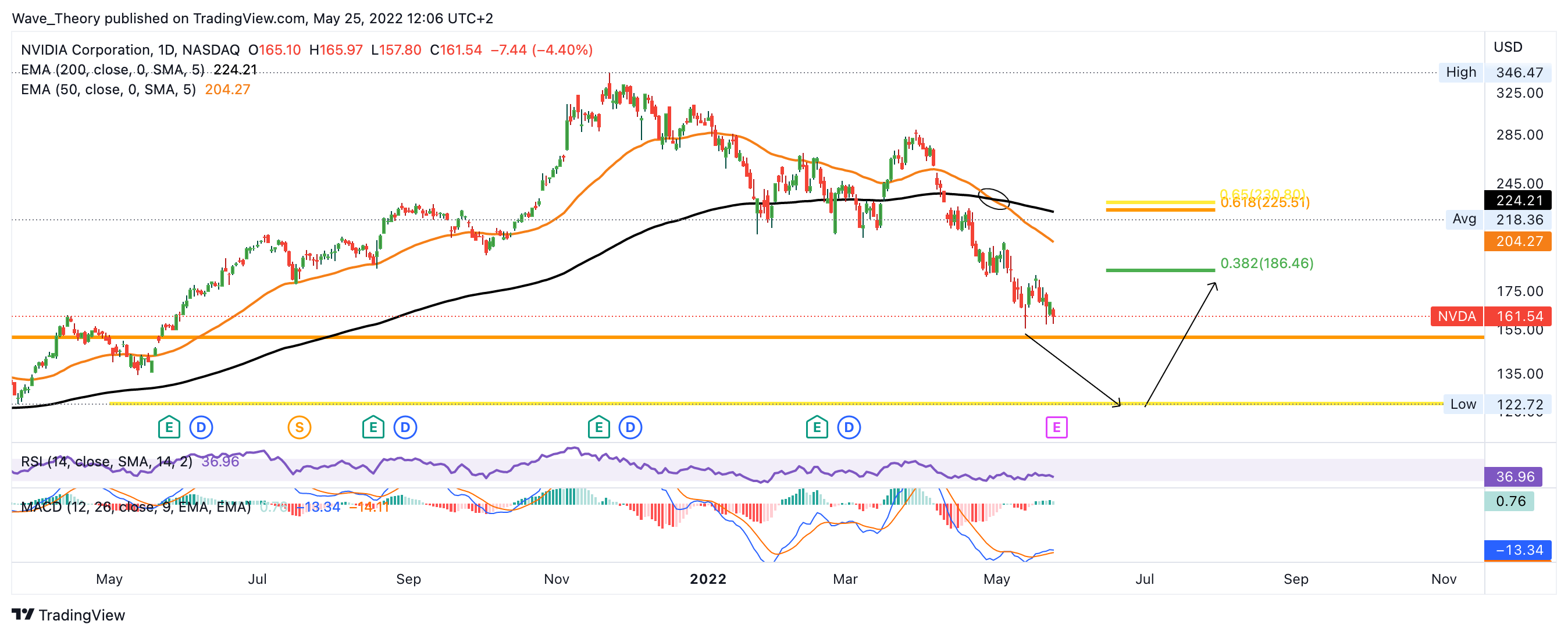 Der NVIDIA Kurs prallte von Januar bis April sehr stark am 0,382 Fib Niveau ab und stieg in Zuge dessen rund 35 %. Im April fiel der NVIDIA Kurs jedoch sehr stark und brach das 0,382 Fib Niveau bärisch, womit sich der NVIDIA Kurs auf dem Weg zur Golden Ratio Unterstützung bei rund zwischen 120 – 150 USD bewegt.