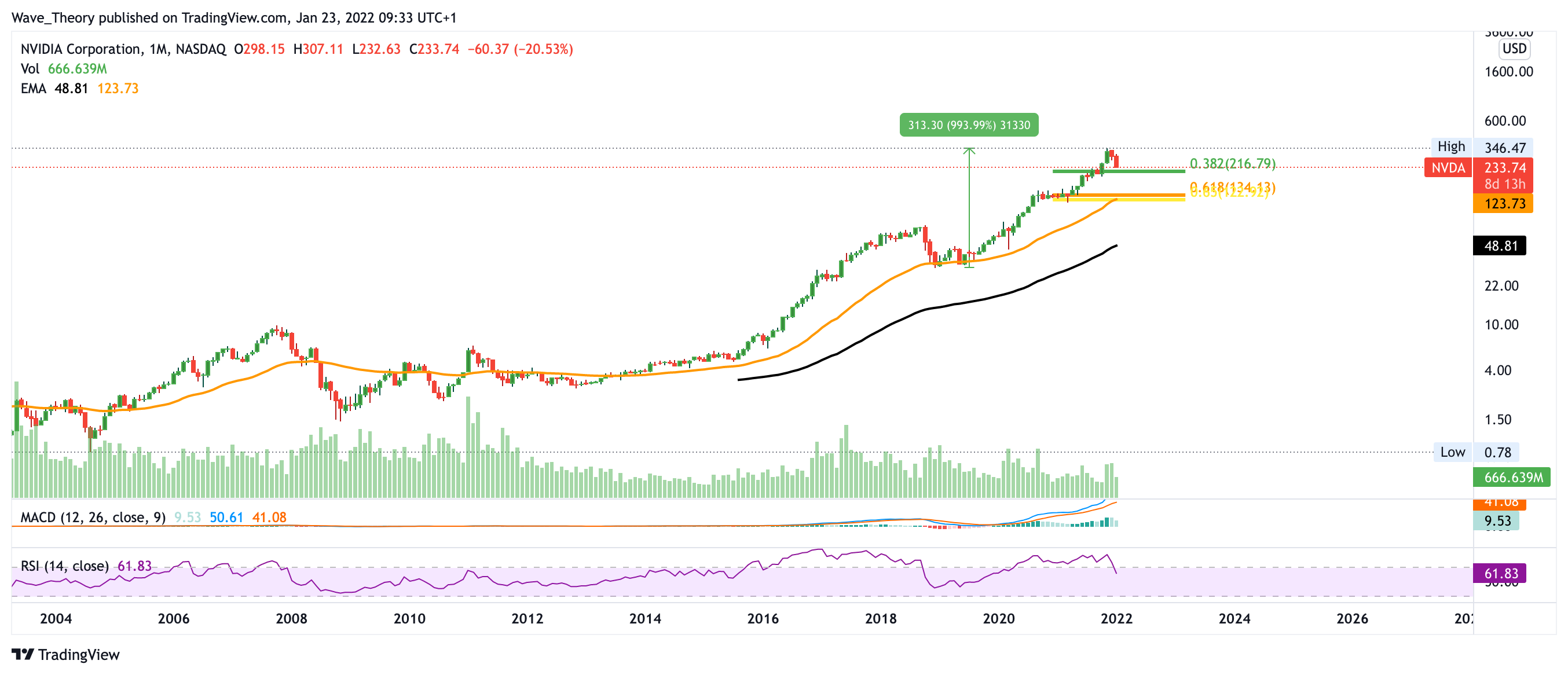 Sollte der NVIDIA Kurs durch die 0,382 Fib Unterstützung durchbrechen, findet er spätestens an der Golden Ratio bei rund 130 USD massive Unterstützung. Dort verläuft zudem der 50-Monate-EMA und der 200-Wochen-EMA. An dieser Stelle könnte der NVIDIA Preis extrem stark abprallen, um seine Korrektur zu beenden und sich zu neuen Hochpunkten aufzumachen.
