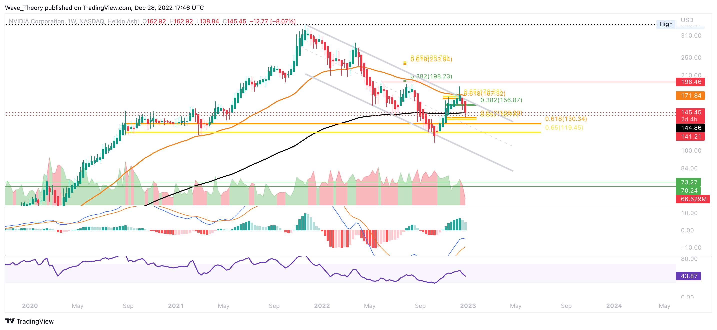 Bricht NVIDIA diese bärisch, wartet bei rund 130 USD die nächste signifikante Fib Unterstützung auf NVIDIA. Sollte NVIDIA an der Golden Ratio bei rund 130 USD bullisch abprallen, wartet am 50-Wochen-EMA bei rund 172 USD der nächste signifikante Widerstand.
