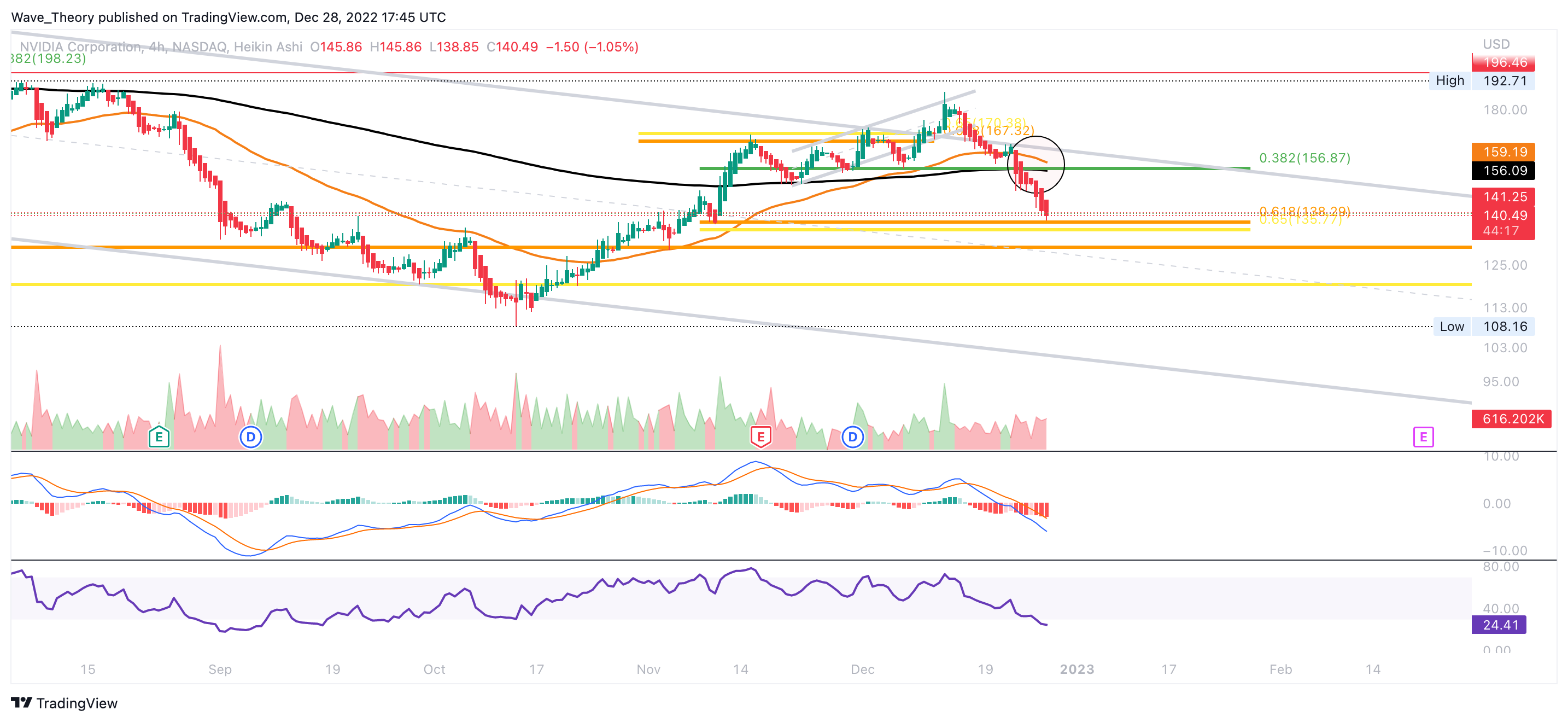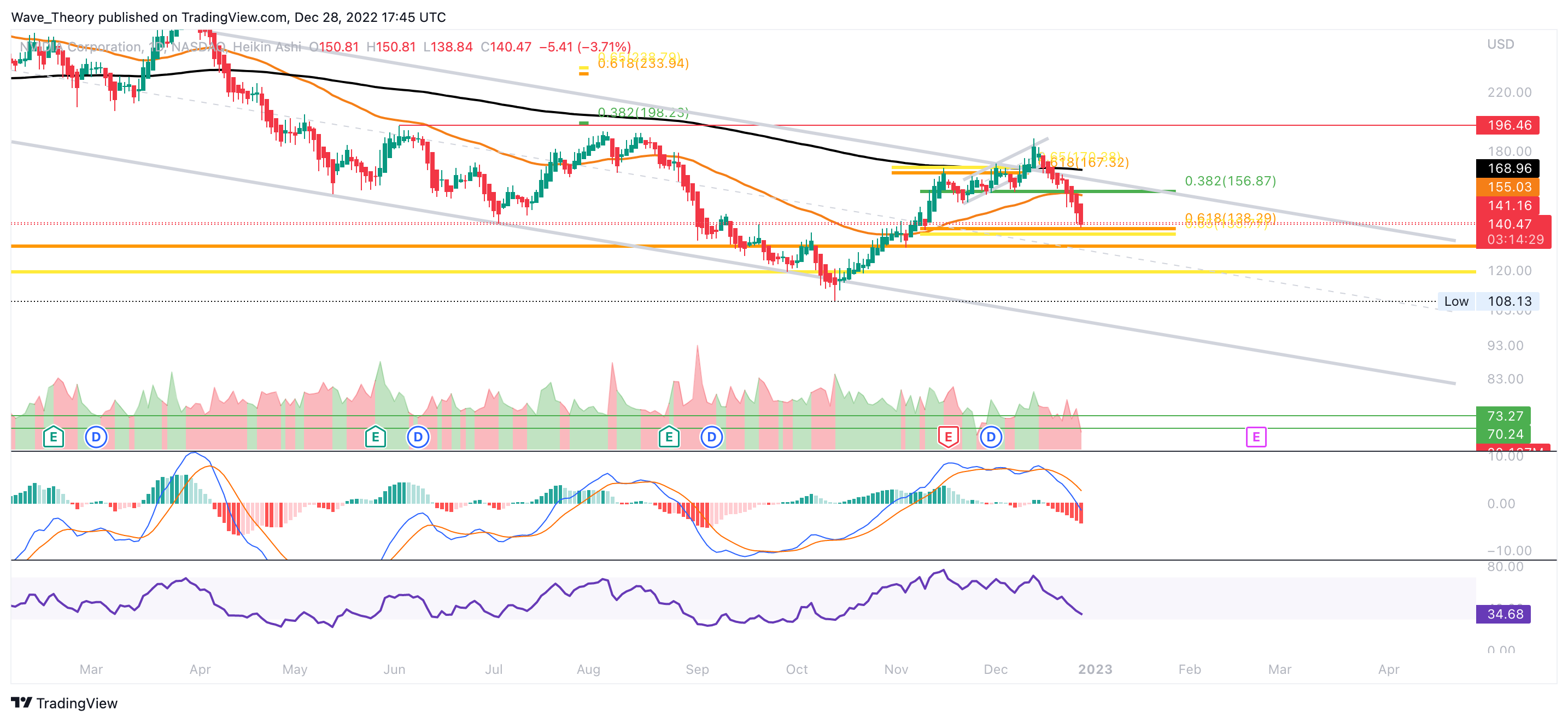 Der NVIDIA Kurs stieg kurzzeitig auf rund 188 USD und wurde anschließend bärisch abgewiesen, nachdem der RSI eine bärische Divergenz aufgebaut hatte. Damit stößt NVIDIA jetzt bei rund 138 USD auf signifikante Fibonacci Unterstützung und sollte diese bärisch gebrochen werden, wartet an der Golden Ratio bei rund 130 USD die nächste signifikante Fib Unterstützung auf die NVDA Aktie.