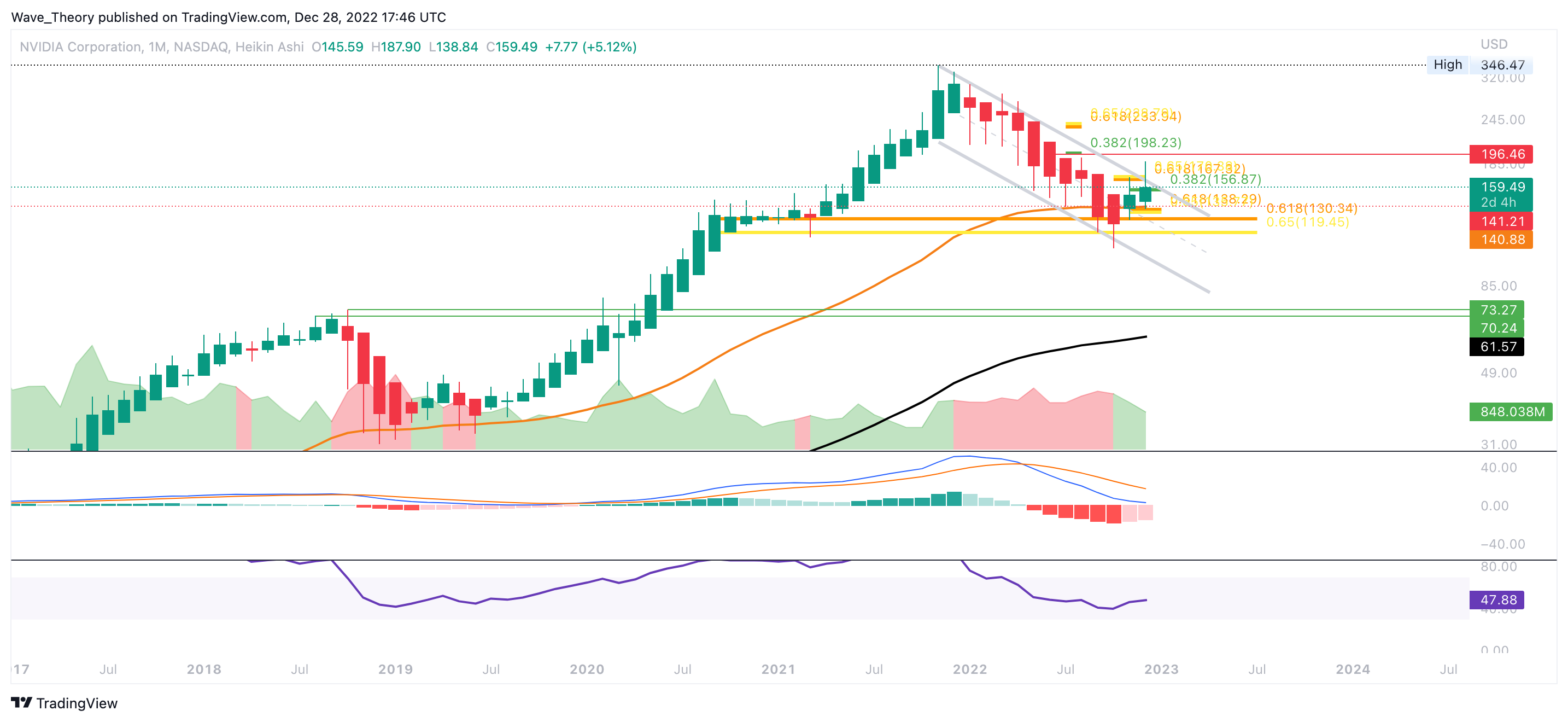 Bricht der NVIDIA Kurs die Golden Ratio Unterstützung bei rund 130 USD bärisch, wartet erst wieder zwischen dem 200-Monate-EMA bei rund 62 USD und dem letzten Hochpunkt aus 2018 bei rund 73 USD signifikante Unterstützung.