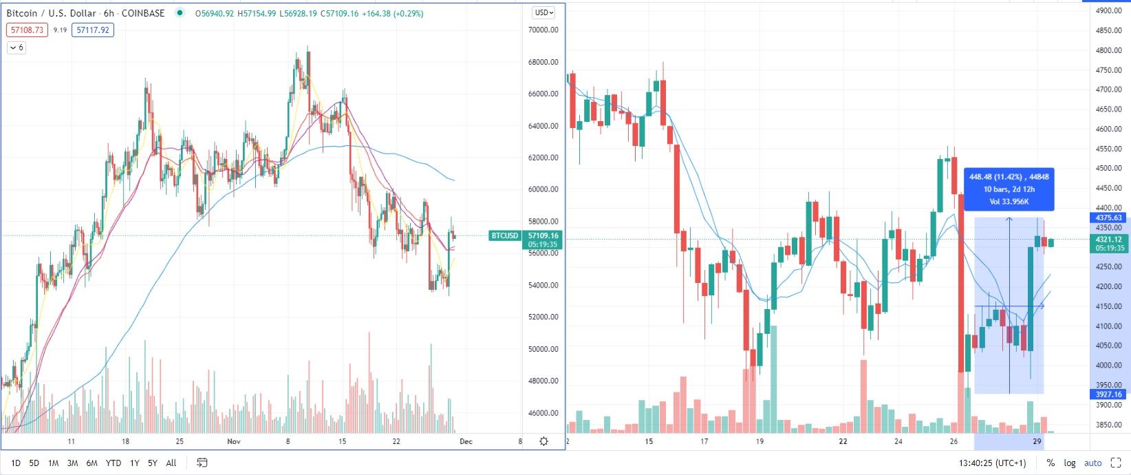 Nach den News über die neue Coronavirus-Variante fielen die internationalen Aktienmärkte und der Krypto-Markt am Freitag, den 26. November 2021, stark ab. Allerdings konnten sich der Bitcoin (8%) und Ethereum Kurs (12%) am Wochenende wieder erholen. Beide Kurse befinden sich inzwischen wieder auf dem Kursniveau vom 26. November. Der ETH Kurs konnte von dem entscheidenden Unterstützungslevel bei 4.000 USD abprallen, während der Bitcoin Kurs das wichtige Support-Level bei 55.000 USD sichern konnte.