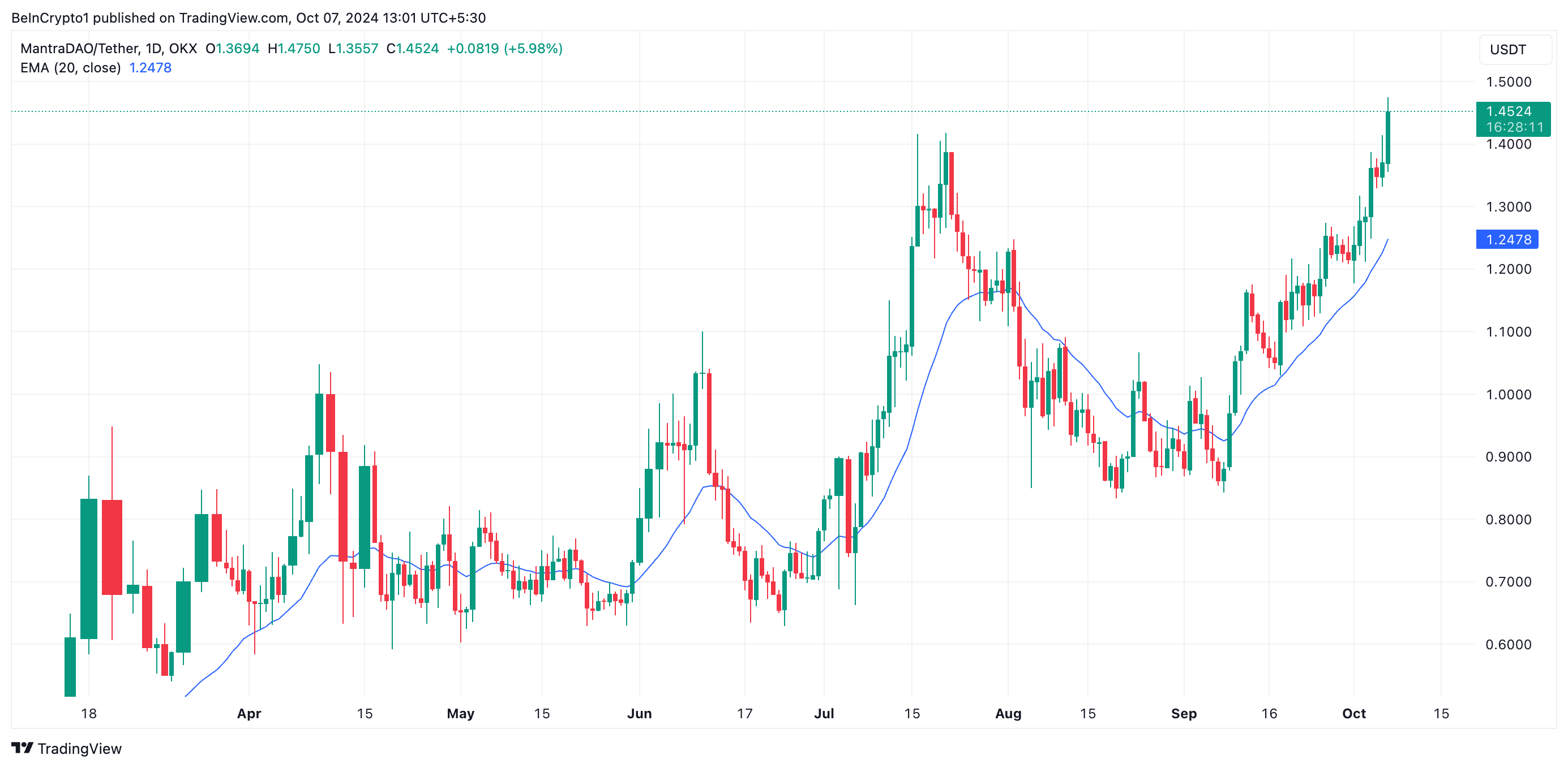 OM, der native Token der realen Vermögenswerte (RWA) Layer-1 (L1) Blockchain Mantra, hat einen neuen Höchststand erreicht und wird derzeit zu 1,45 USD gehandelt. In den letzten 24 Stunden stieg der Kurs um sieben Prozent, während das Handelsvolumen um 78 Prozent auf insgesamt 40 Millionen USD anstieg.