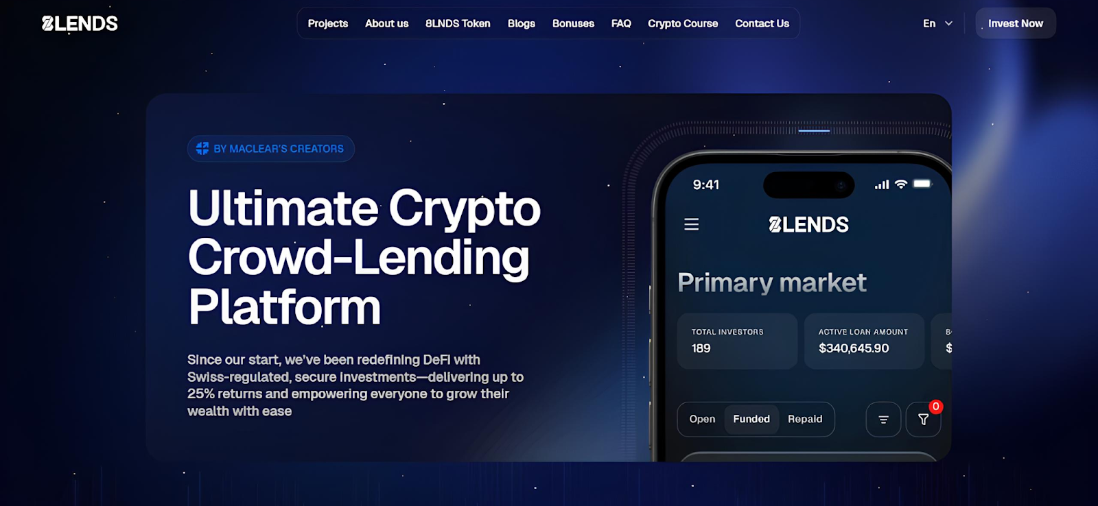 Das Projekt wurde von der Schweizer Firma Maclear AG ins Leben gerufen, einem Fintech-Unternehmen, das 2020 gegründet wurde und bisher mehr als 60 Millionen Euro finanziert hat. 8lends ist die Web3-Version ihres P2P-Kreditmodells, jedoch mit mehr Transparenz, Automatisierung und globaler Reichweite dank der Blockchain.